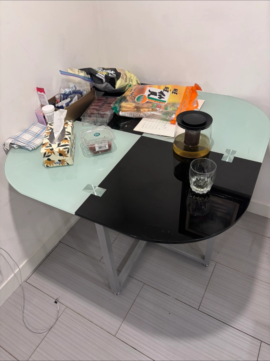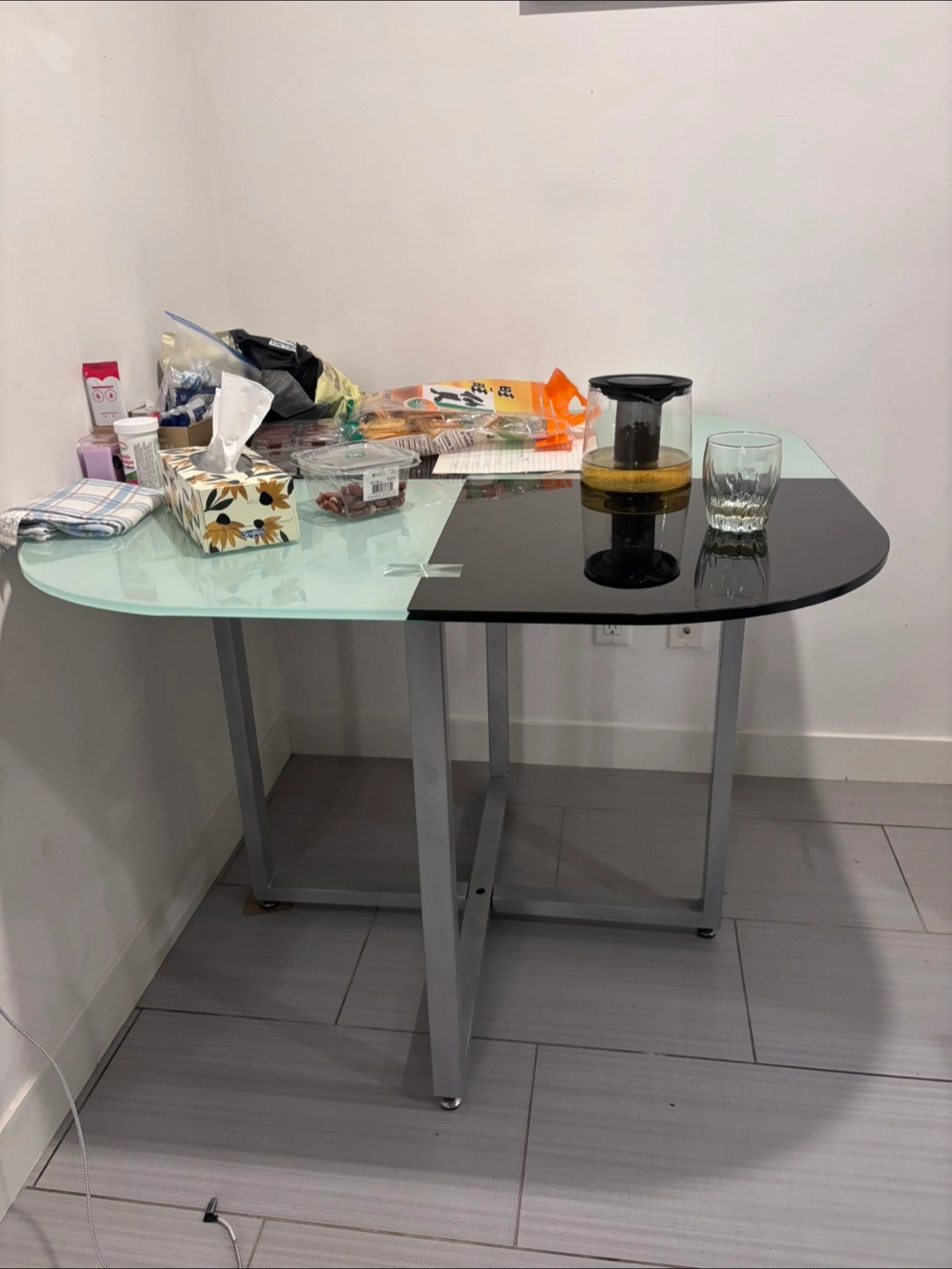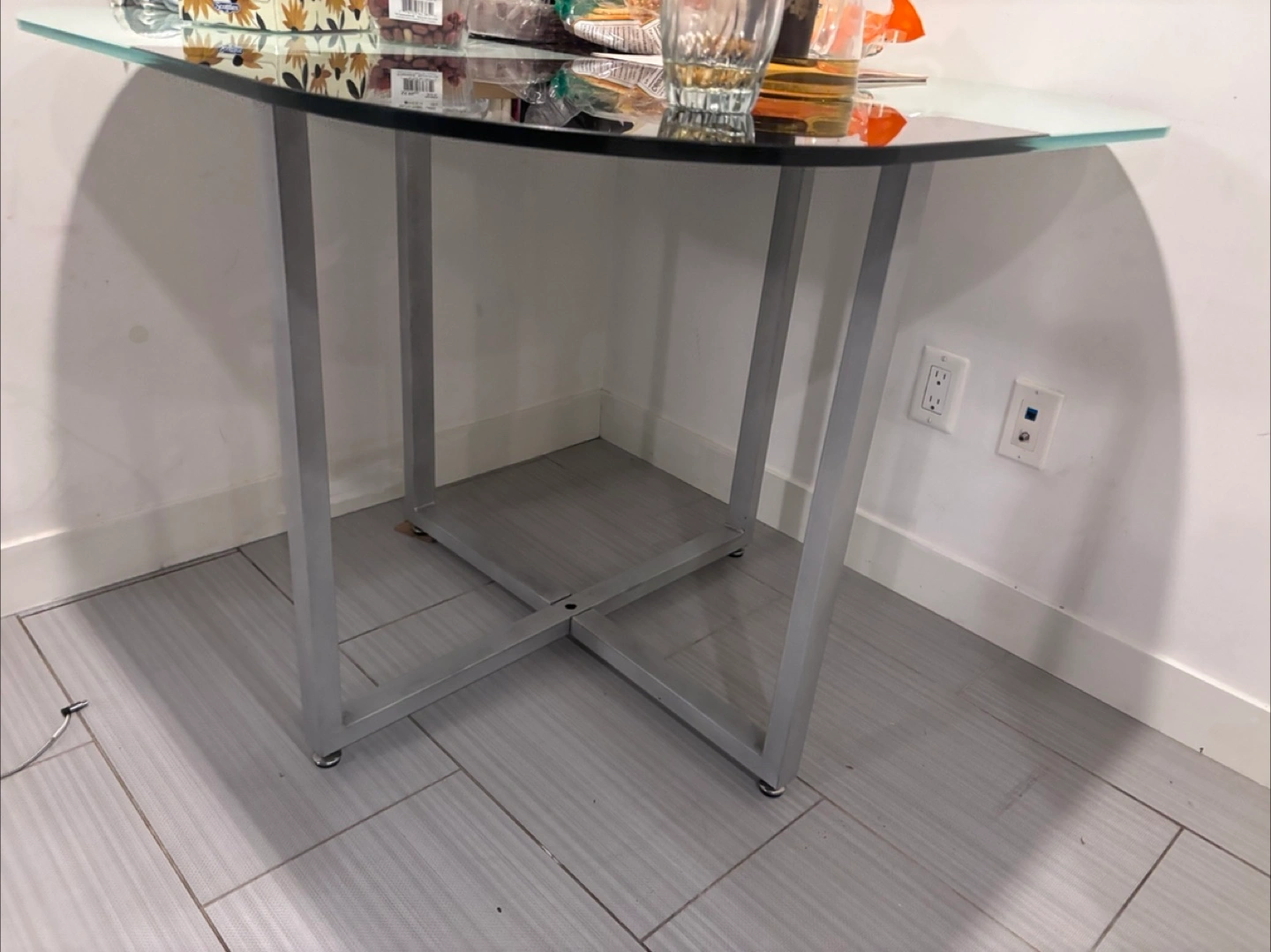 Selling a dining table with a glass top and silver legs. It's in good condition and ready for a new home! Perfect for a small dining area or kitchen nook