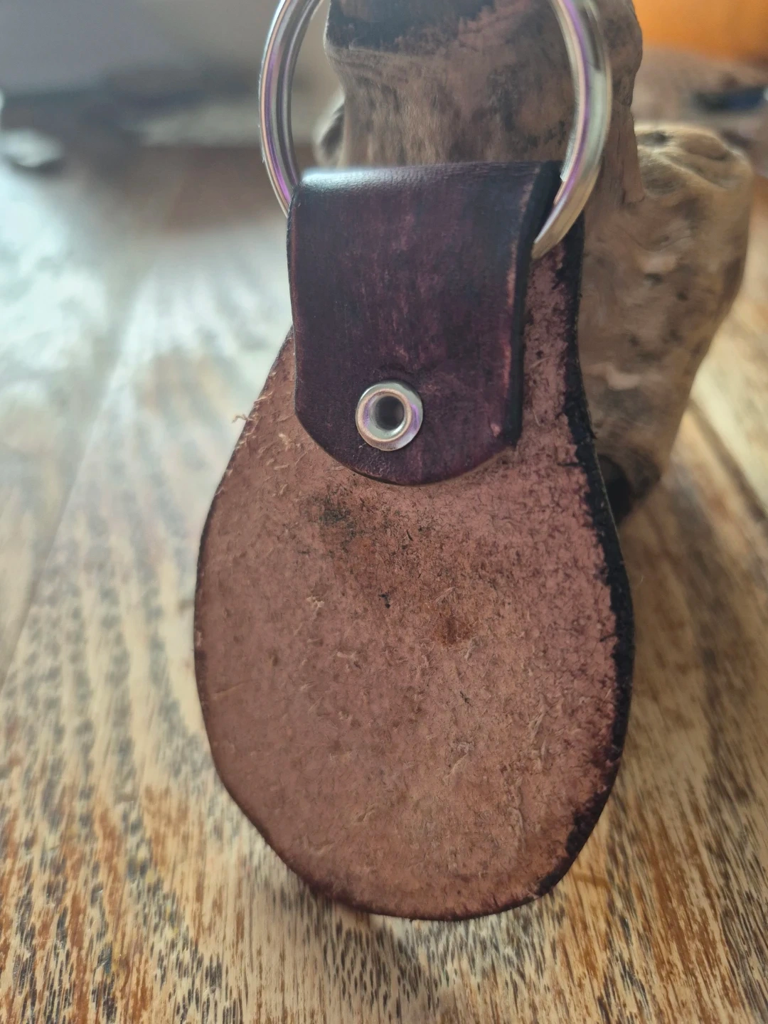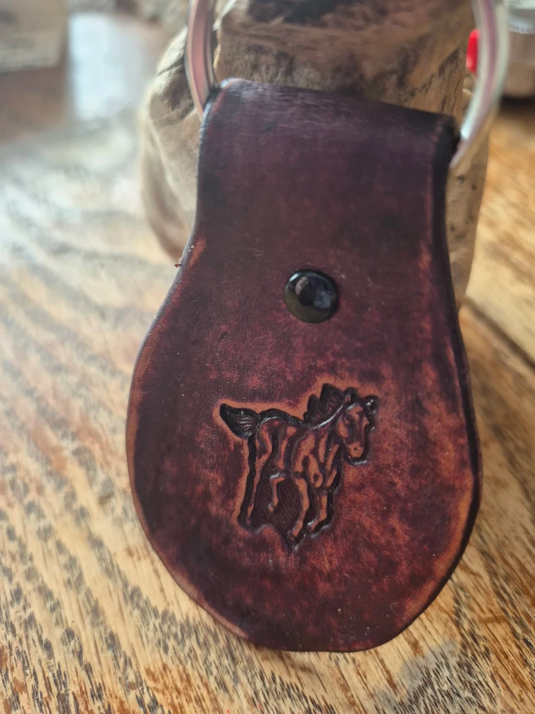 Here's a unique leather keychain! It features a rustic trotting horse design. It's ready to attach to your keys or bag