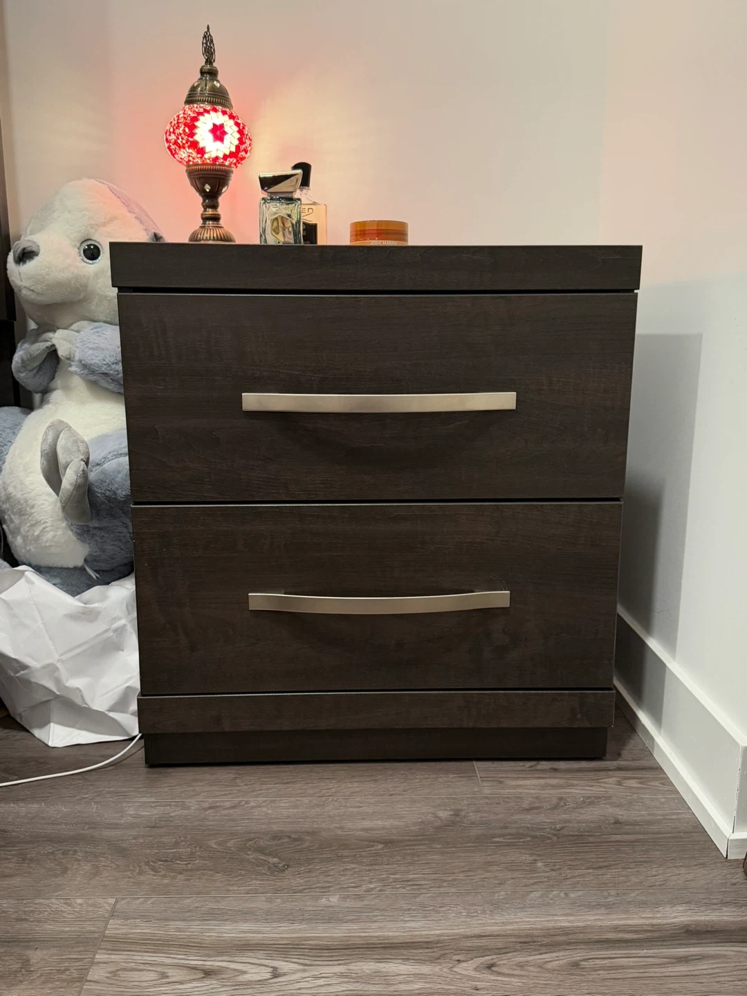 Here's a dark brown nightstand with two drawers. It's in great shape and ready to use in your bedroom or living space. Perfect for storing your bedside essentials or displaying decorative items!