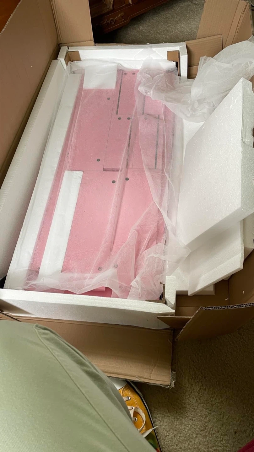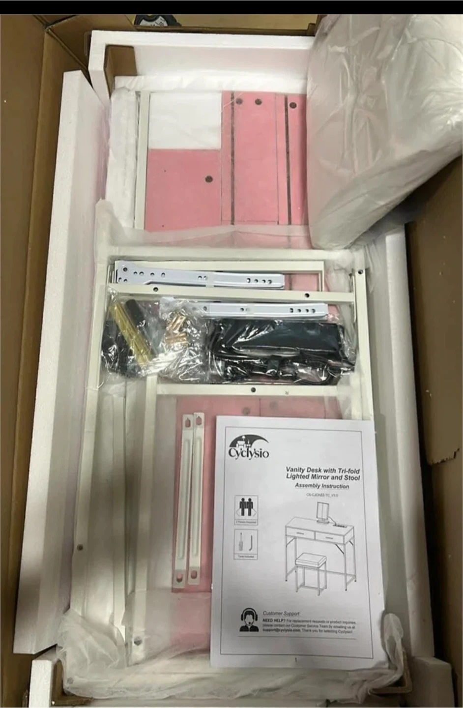Selling a brand new Cyklisio vanity desk with stool! It's still in the box and ready to be assembled. The desk features a pink top with white legs and gold handles. The dimensions are 35.8" x 15.7" x 30.5". Perfect for a bedroom or home office