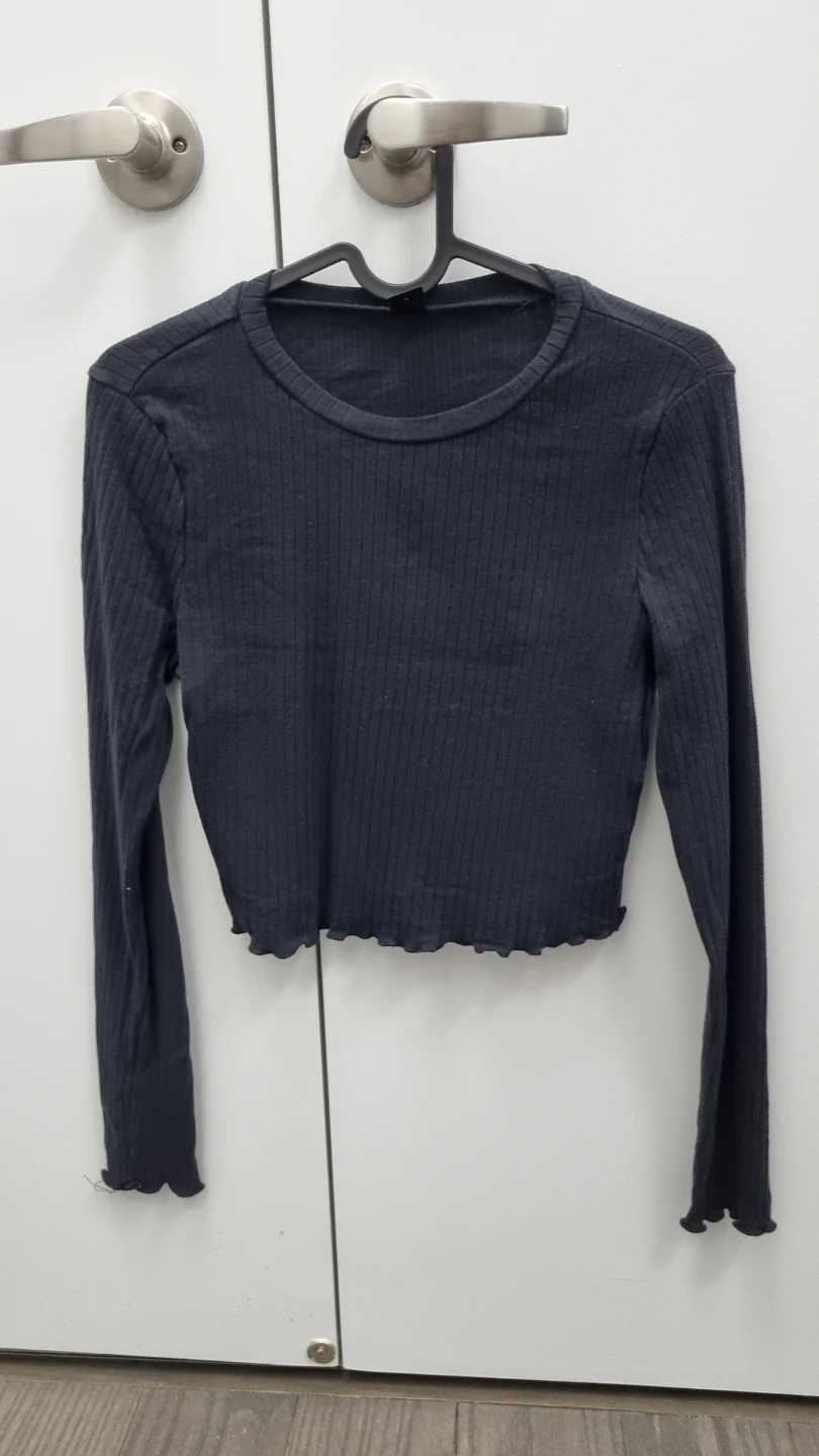 A cute cropped long-sleeved ribbed top! It features a round neckline and is great for layering or wearing on its own. Size tag shown in images