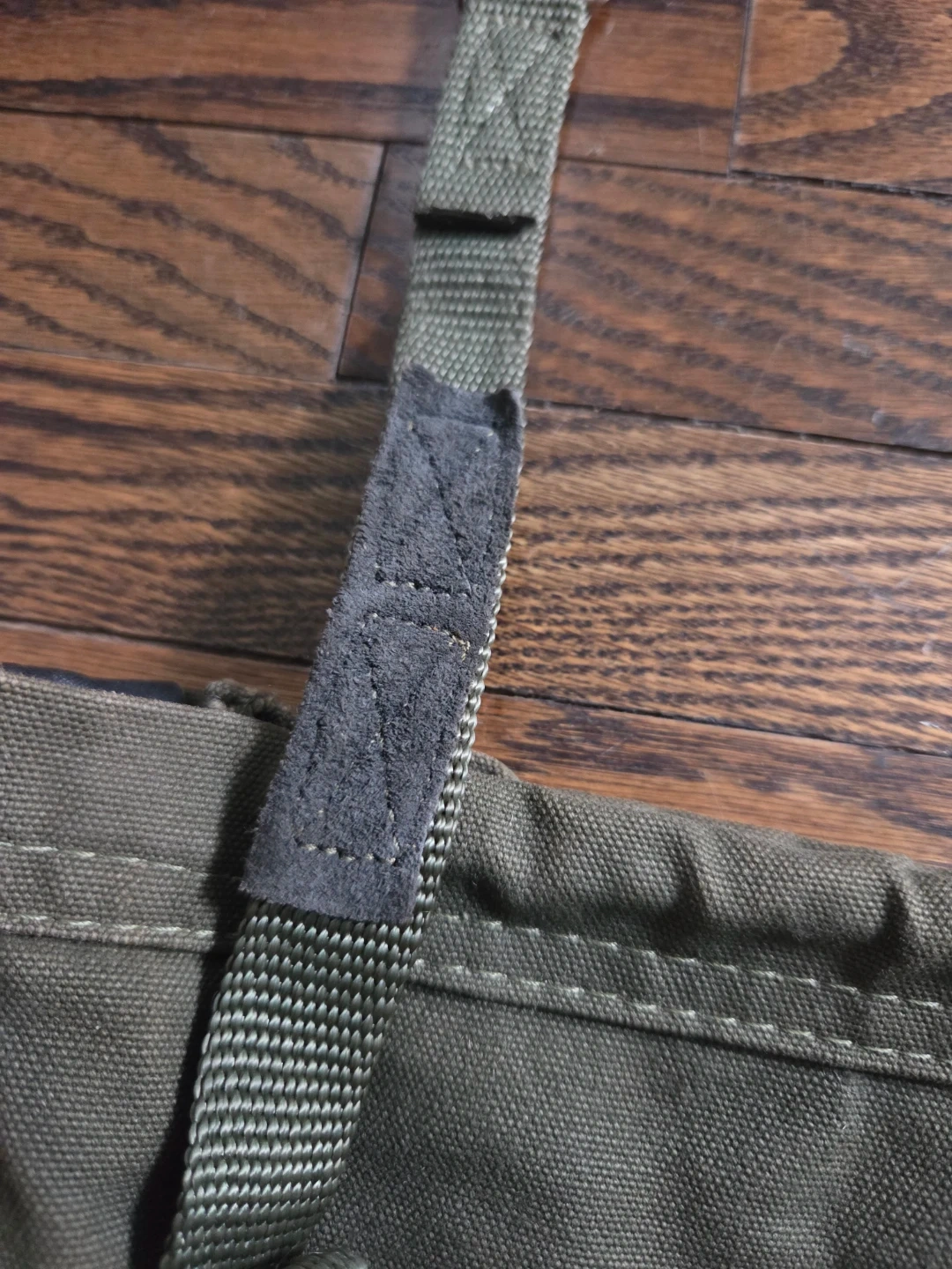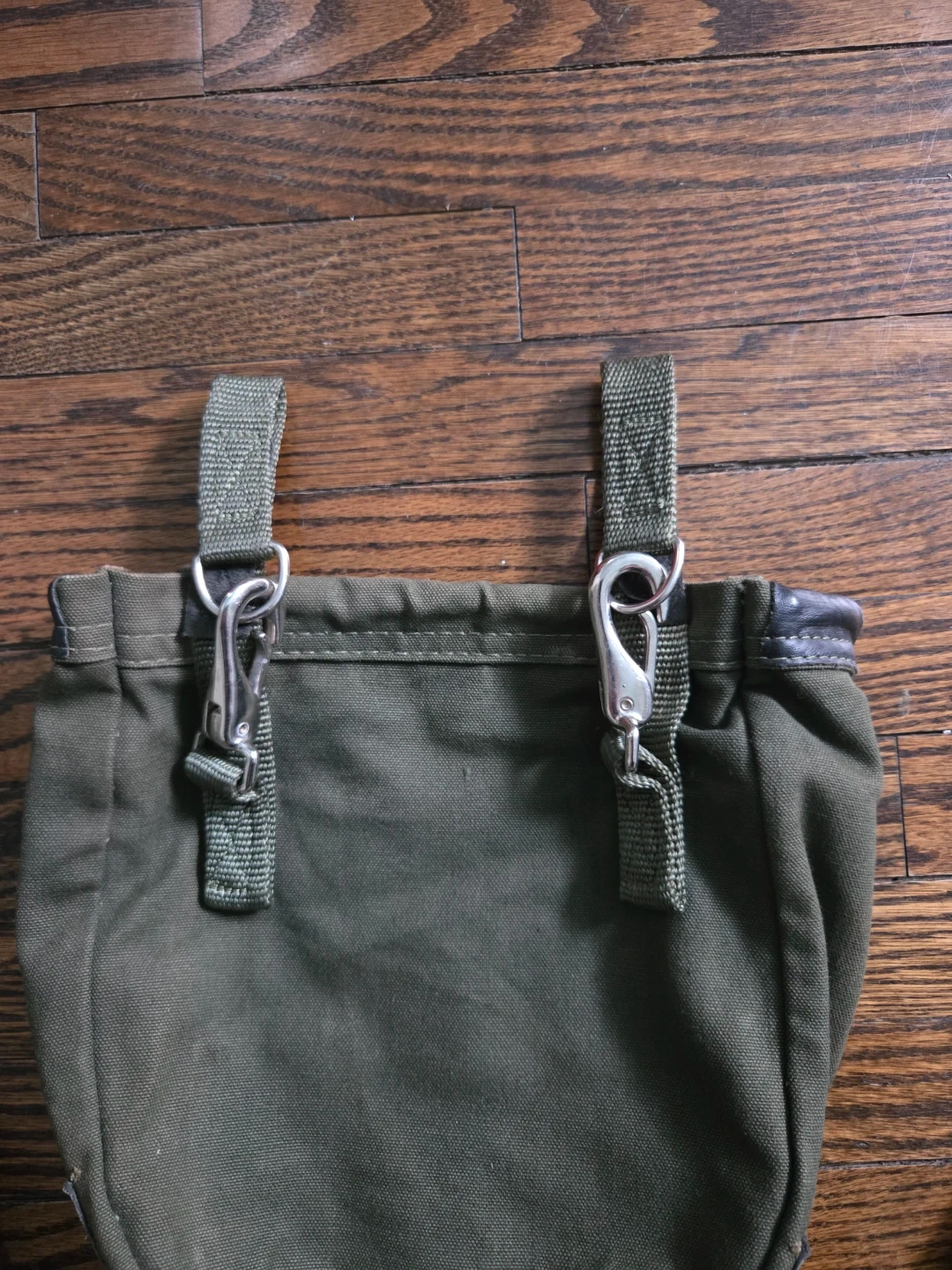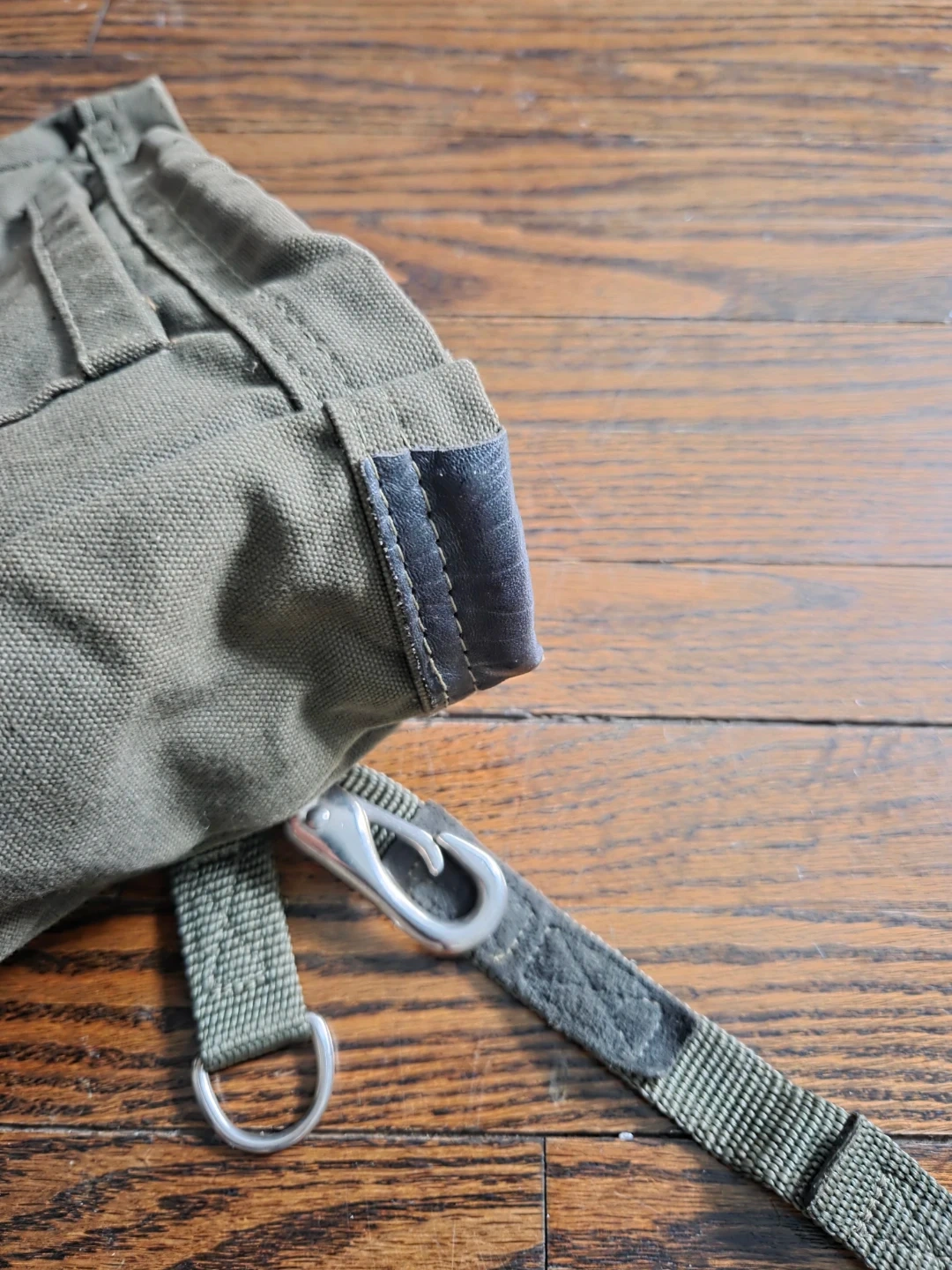 Designed for easy attachment, it features two nylon webbing straps with snap and dee ring fasteners that hook onto your belt or harness. The top opening is reinforced with nylon rope for added strength, making this pouch a reliable choice for professionals in the field.