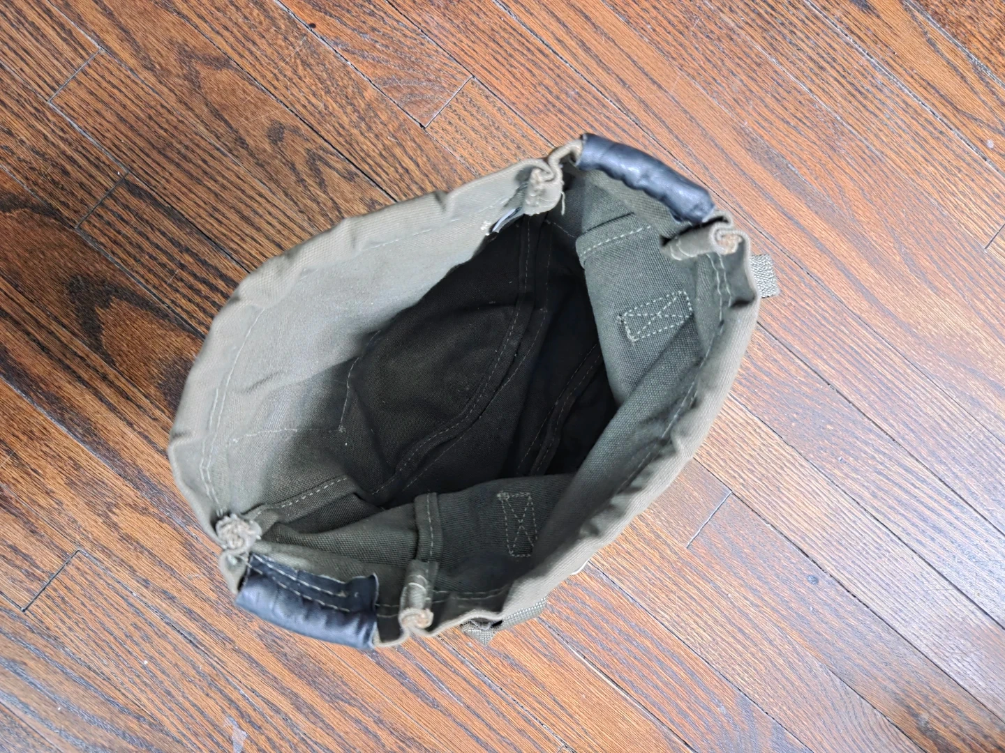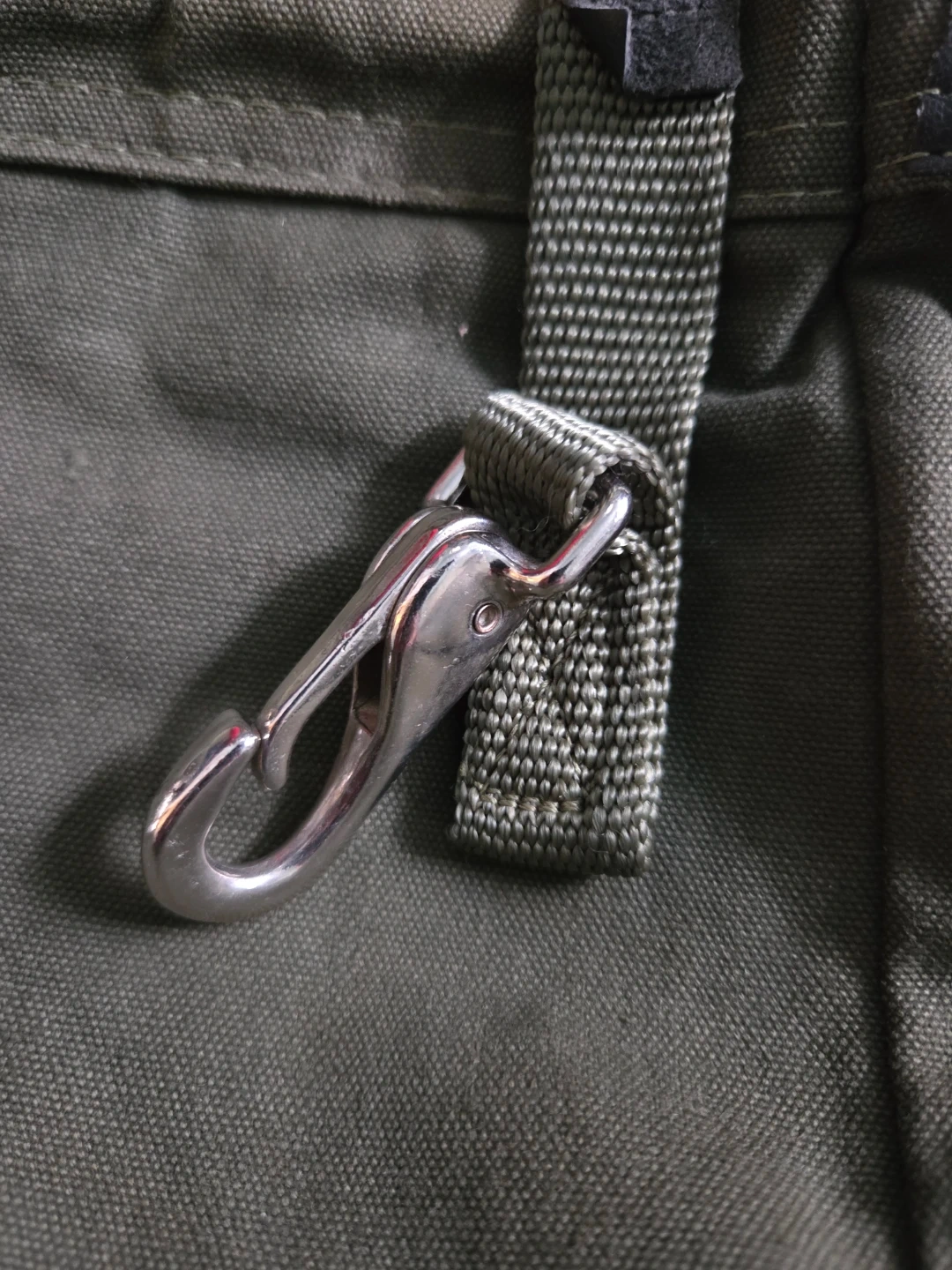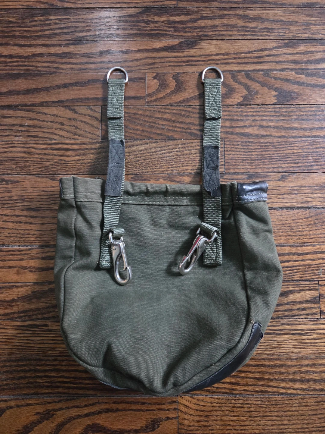 Designed for easy attachment, it features two nylon webbing straps with snap and dee ring fasteners that hook onto your belt or harness. The top opening is reinforced with nylon rope for added strength, making this pouch a reliable choice for professionals in the field.