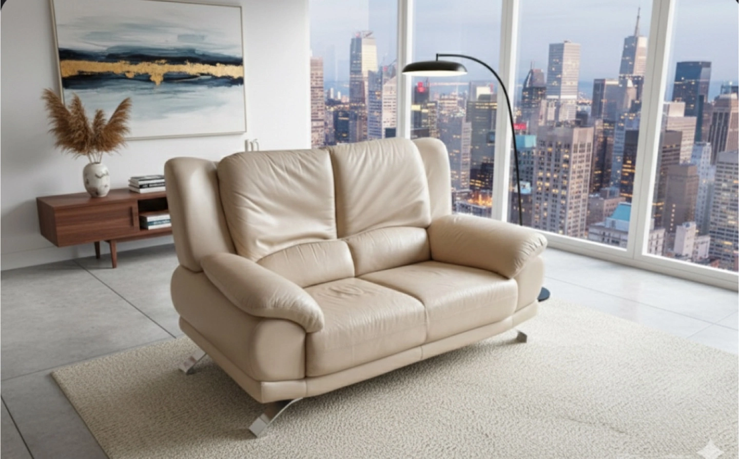 Selling a comfy beige leather loveseat. It's in great shape and would look lovely in any living room or den! Its neutral colour ensures it will match any decor