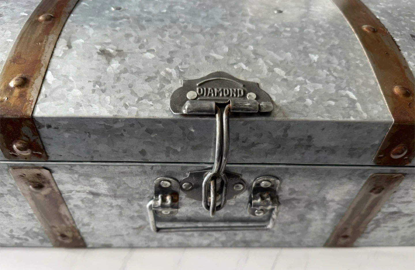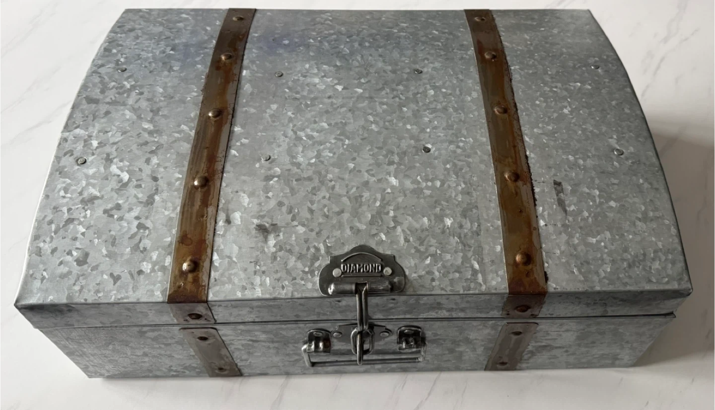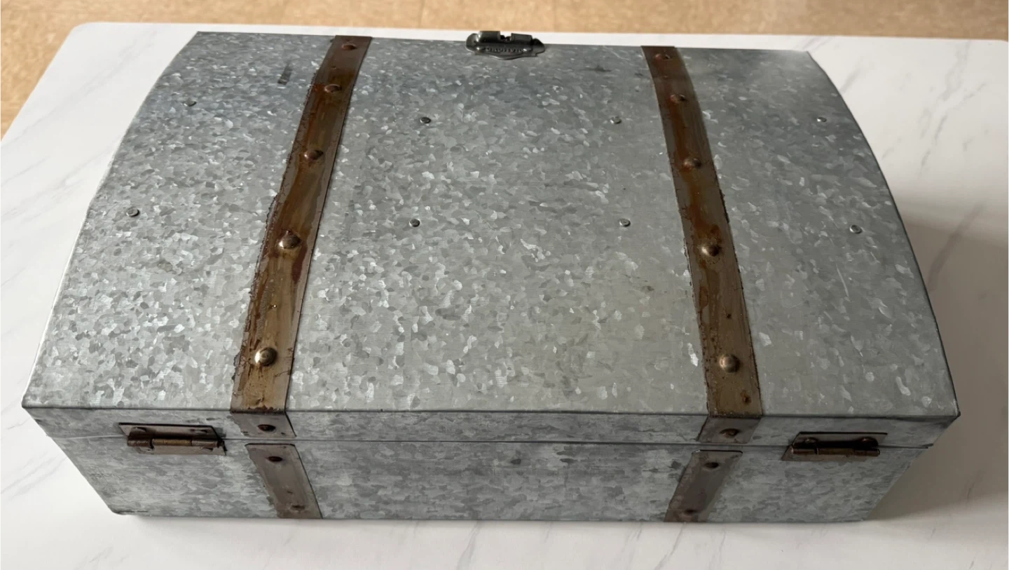 Selling a galvanized metal trunk with a rustic design. The trunk has a latch closure and metal banding with rivet details. It's a great piece for storage or decor!