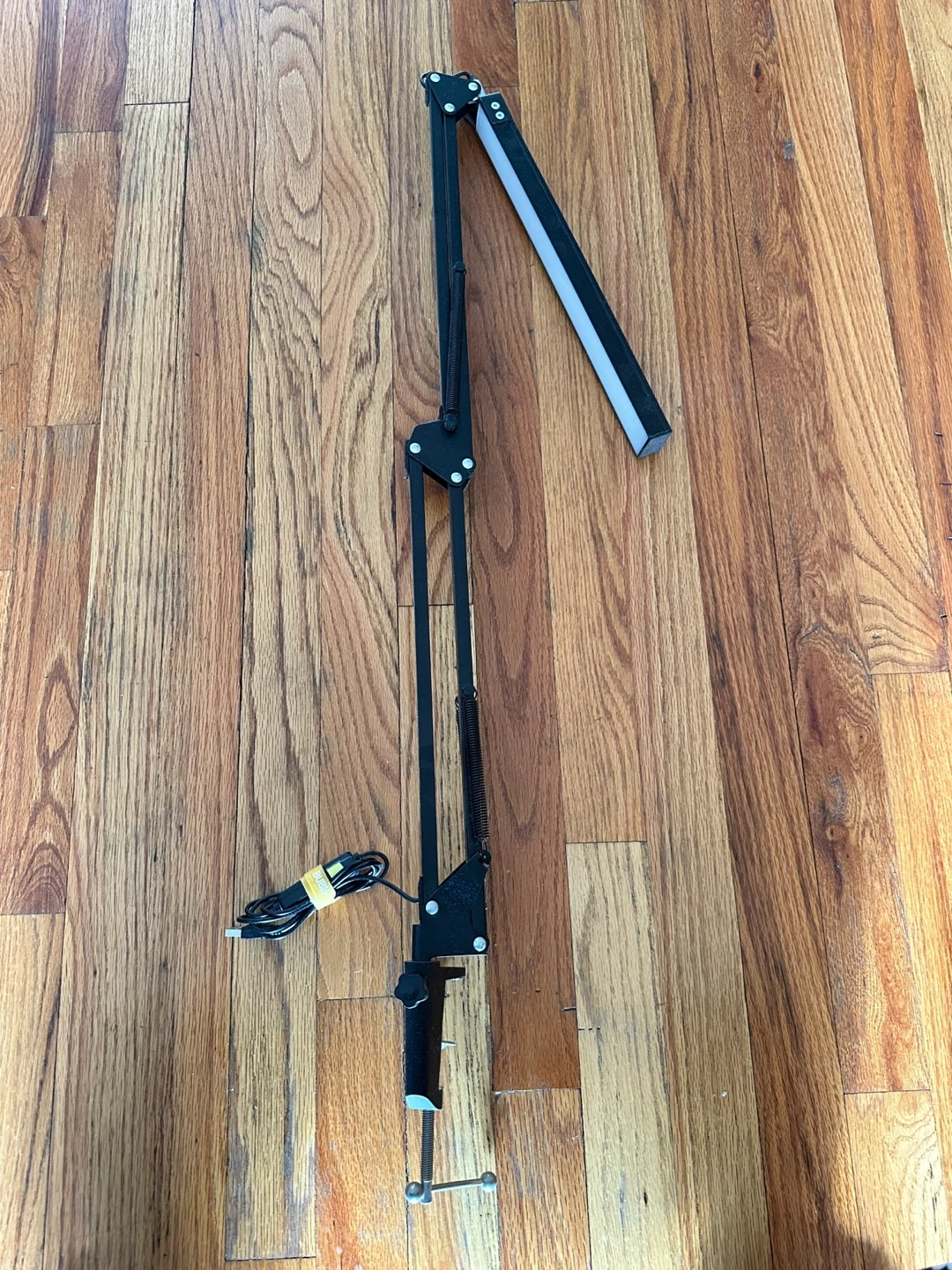 Selling a black LED desk lamp. It features an adjustable arm and a clamp for easy attachment to desks or tables. The lamp also comes with a USB cable and a control panel for adjusting the brightness