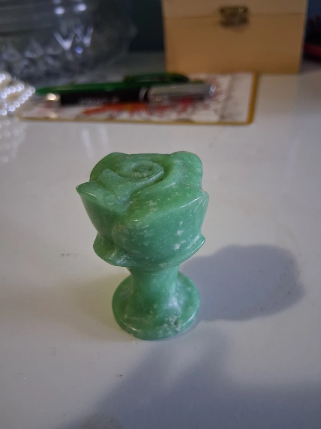 Selling a lovely green aventurine quartz rose stone. It's a beautiful piece for any collection or as a decorative item. The stone is in great condition and ready to bring some positive energy to your space