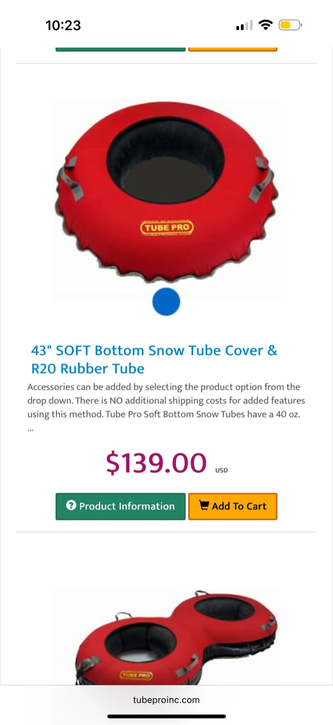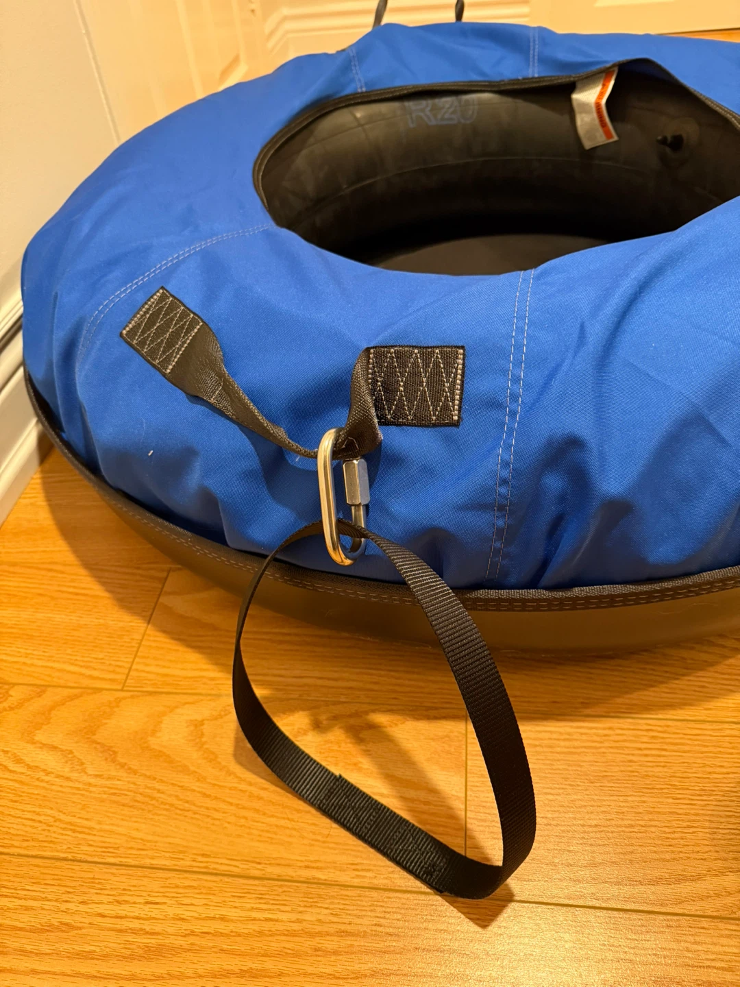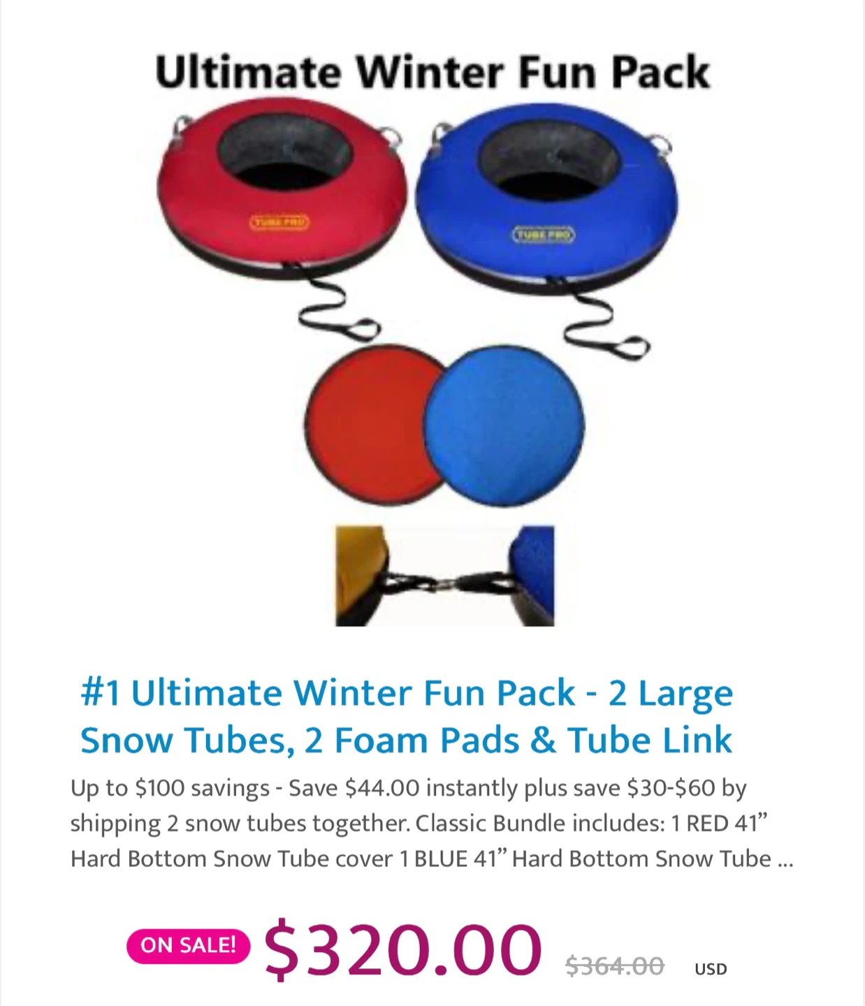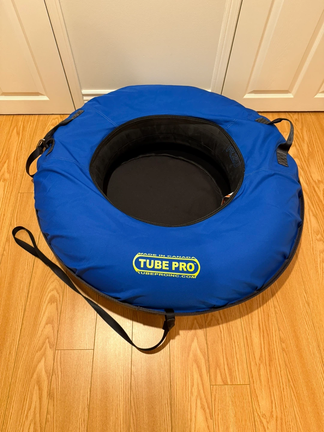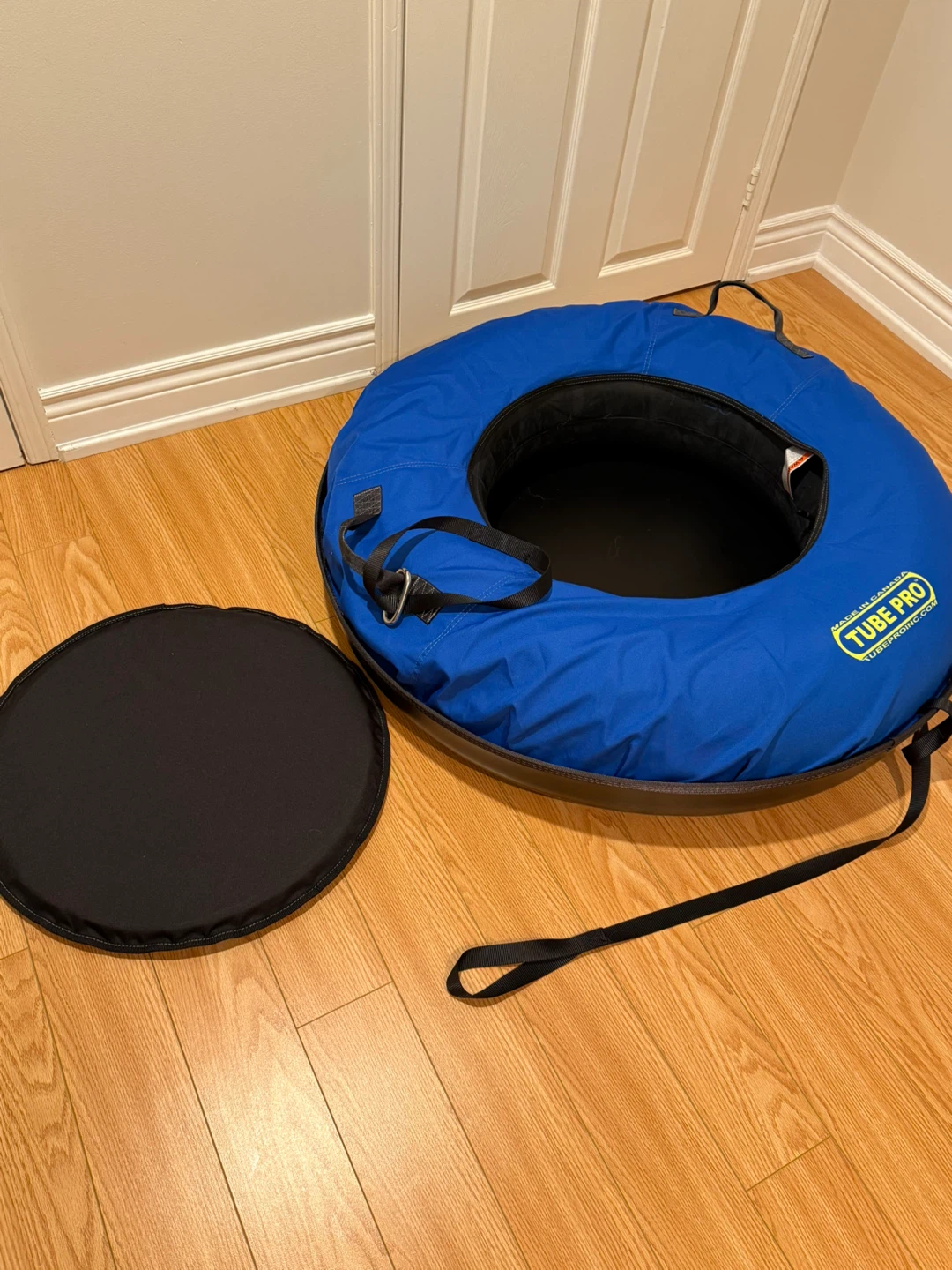 Get ready for some winter fun with this Tube Pro snow tubes! They are blue and red and comes with a hard bottom and a foam pad inside that is removable. Adult size large. Perfect for enjoying the snow this season! You can also attach the 2 snow tubes. Used only once so they look new. Includes heavy duty tube link.