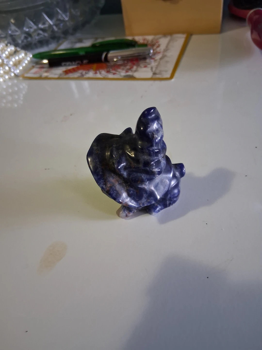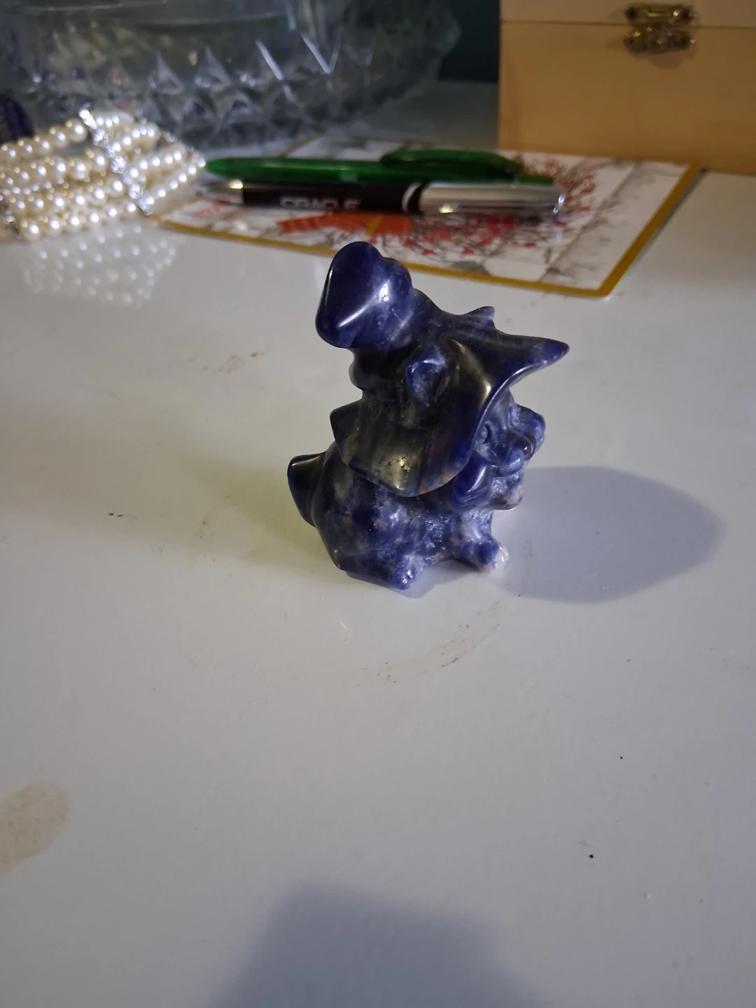 Embrace the magic with this charming, hand-carved sodalite figurine, featuring a cat in a whimsical witch's hat. This unique piece is perfect for those who love all things mystical, spiritual, or simply adore unique gemstone art.