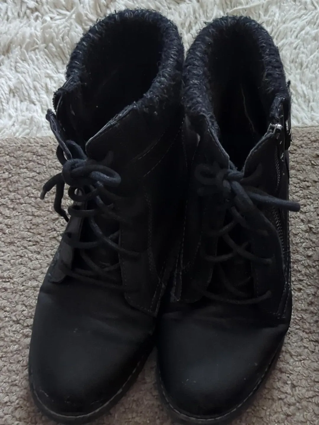Here are a pair of black ankle boots! They feature a lace-up design and a side zipper. They're in good condition and ready for a new owner