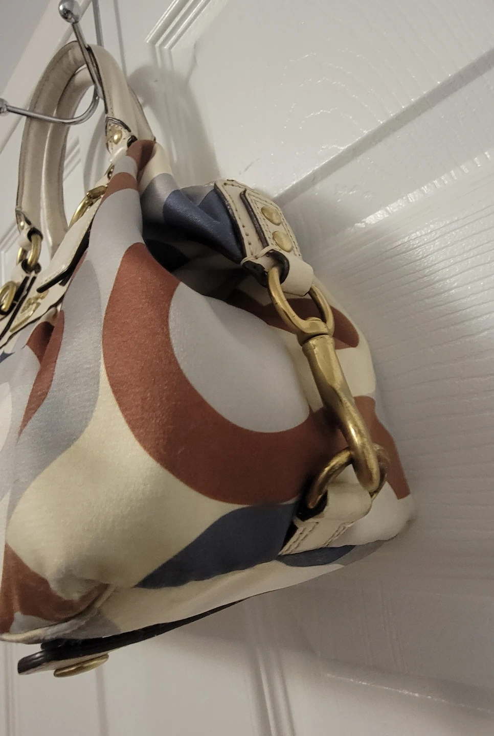 Selling a Coach satchel handbag. It has a unique circle pattern and gold accents. It's in good condition and ready for a new home!