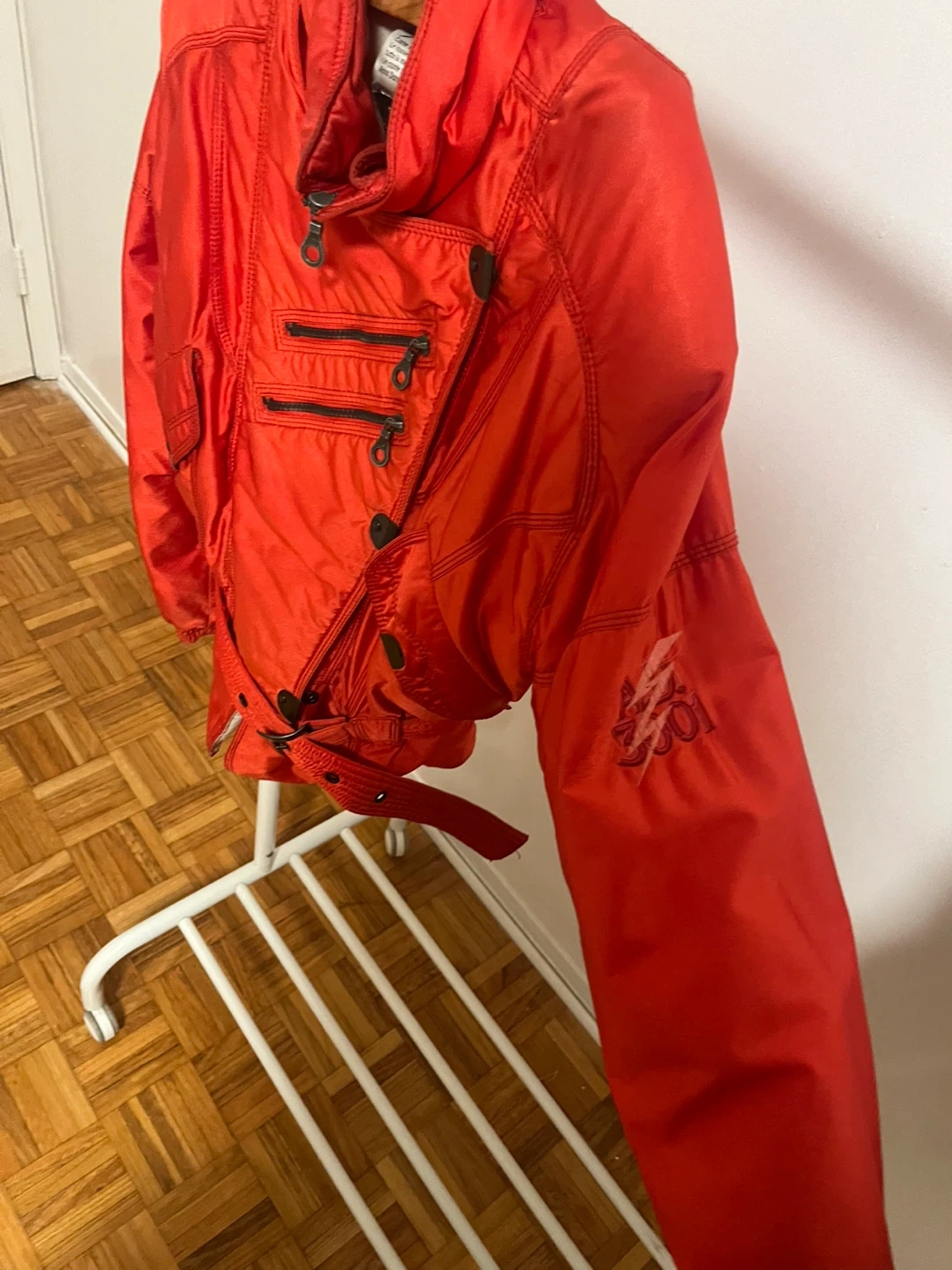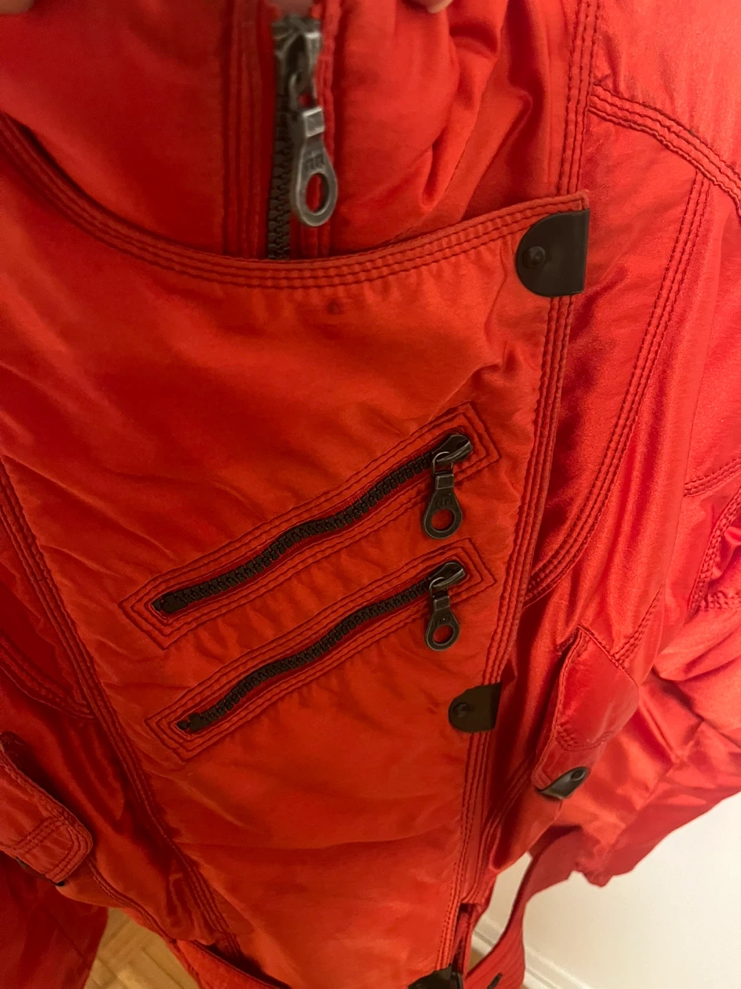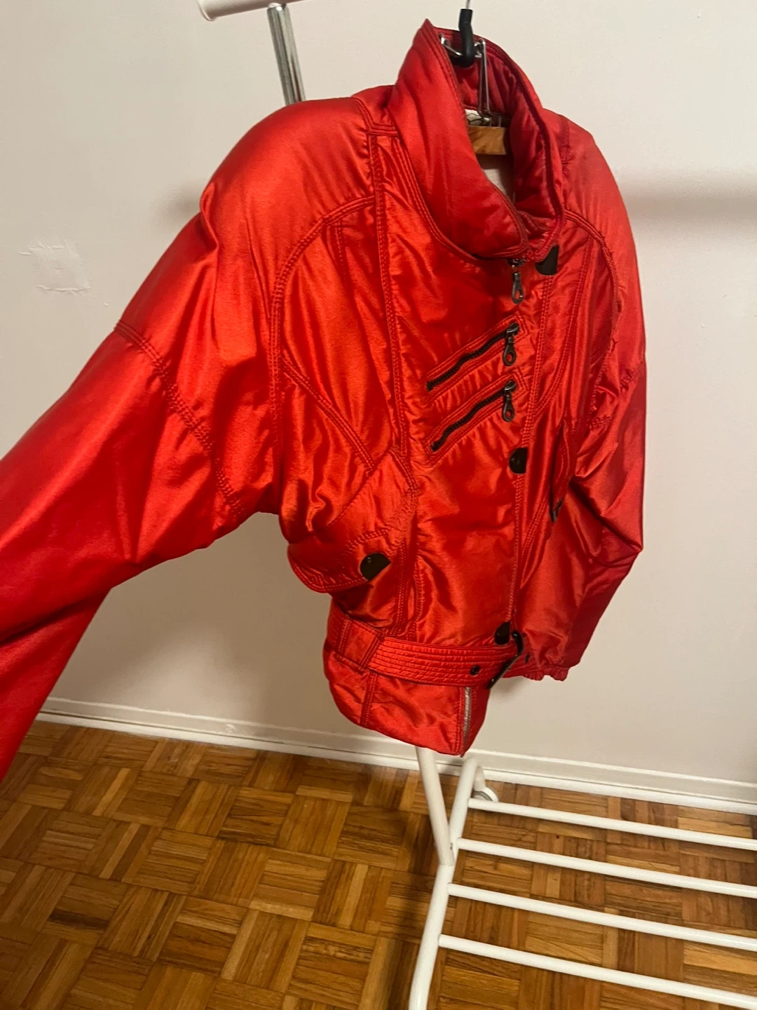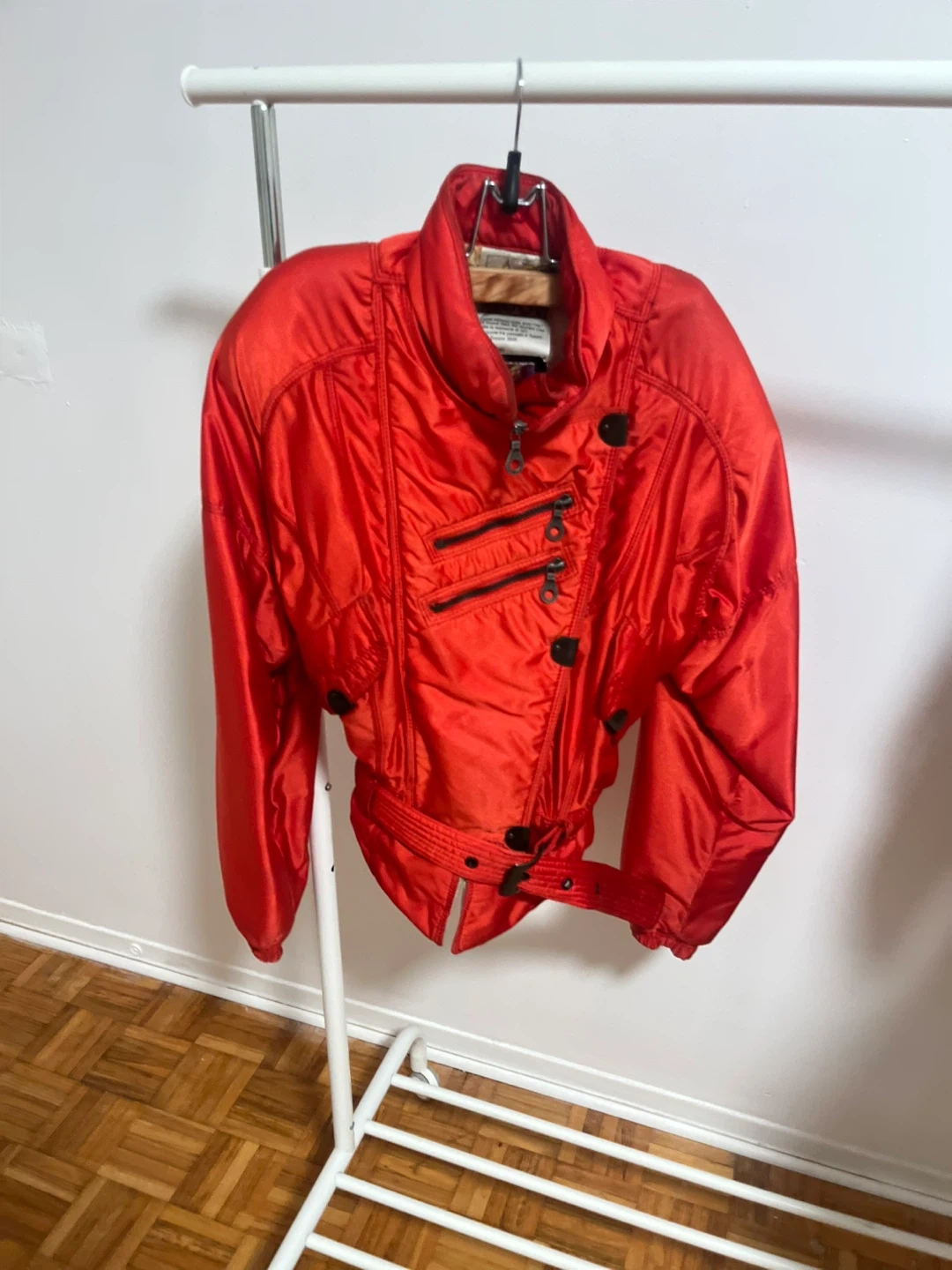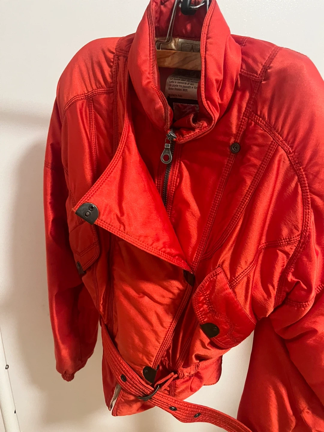 Selling a vibrant red padded jacket from AD 3001 Italian vintage skiwear lined very warm It features a unique design with multiple zippers and a belted waist. Perfect for adding a pop of colour to your wardrobe and staying warm.