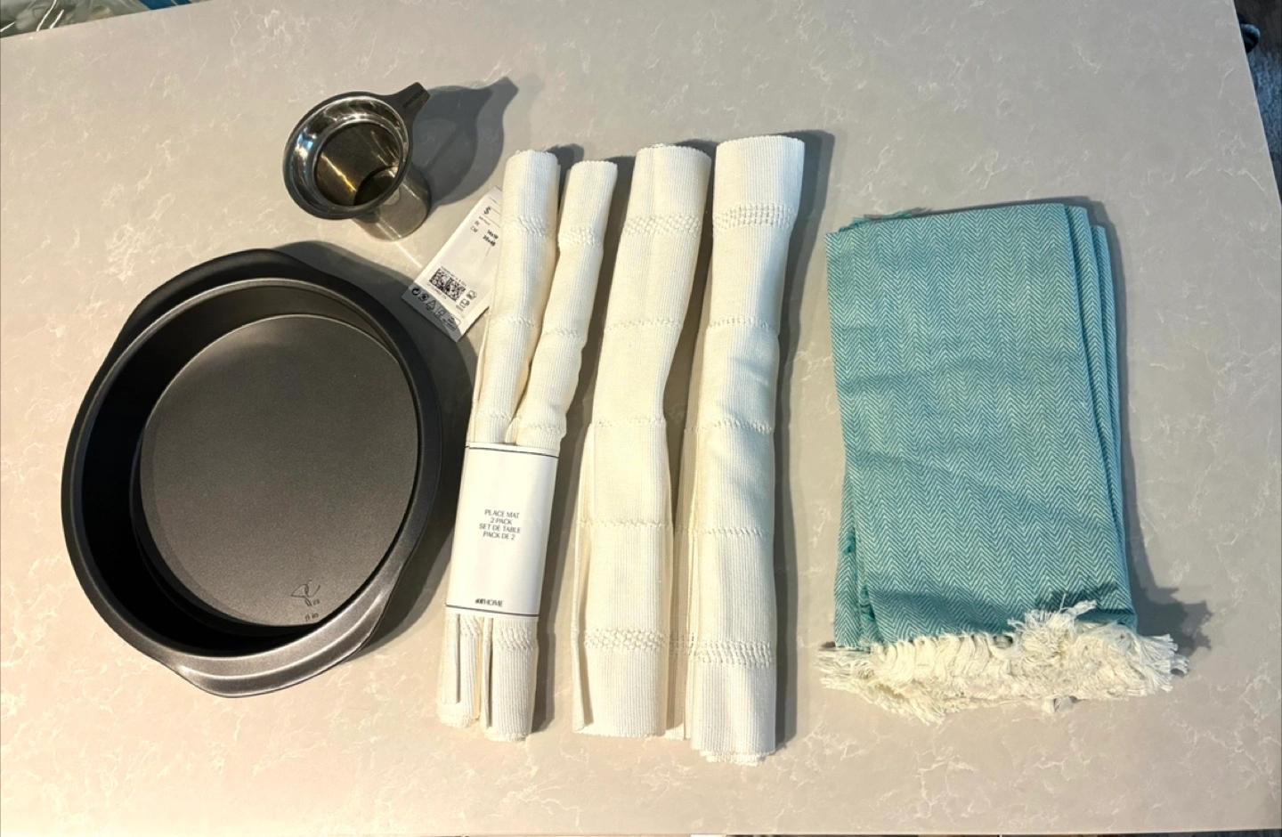 Includes set of 4 napkins, 4 placemats, a cake pan, and a tea steeper. Giving away as a bundle, not individually. Please only message if you need the items, not intended for resale.