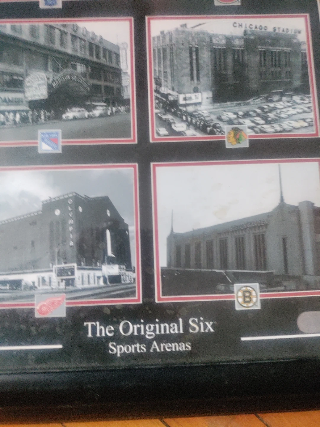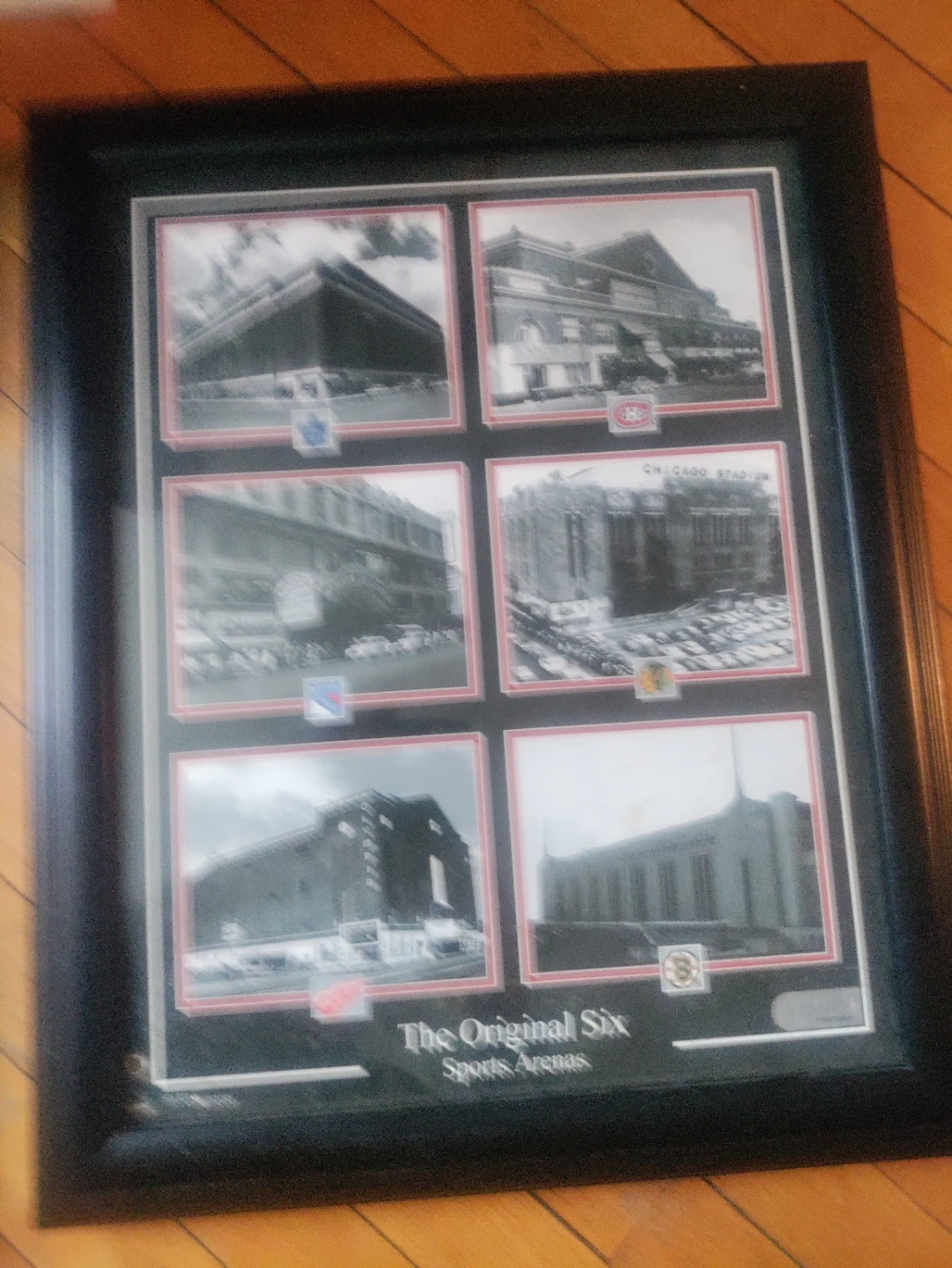 Framed print showcasing "The Original Six Sports Arenas". It features black and white photos of the original hockey arenas. A great piece for any hockey fan!