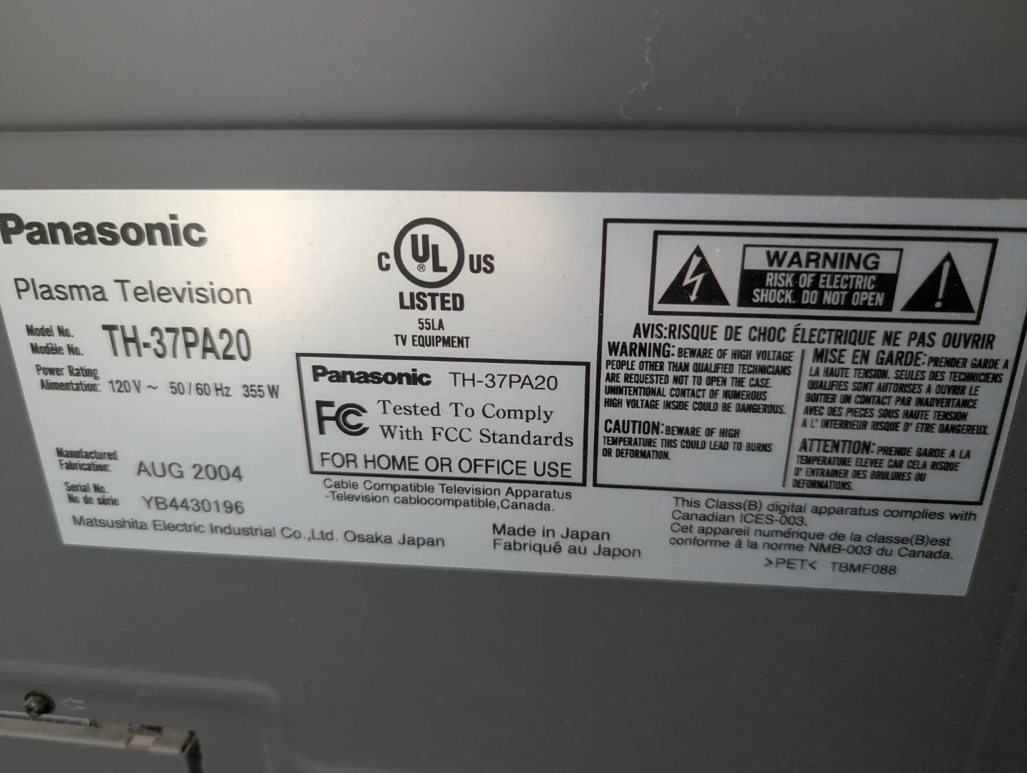 Selling a Panasonic Plasma Television, model TH-37PA20. It's a solid TV for anyone looking for a reliable display. The TV is a cable compatible television apparatus.