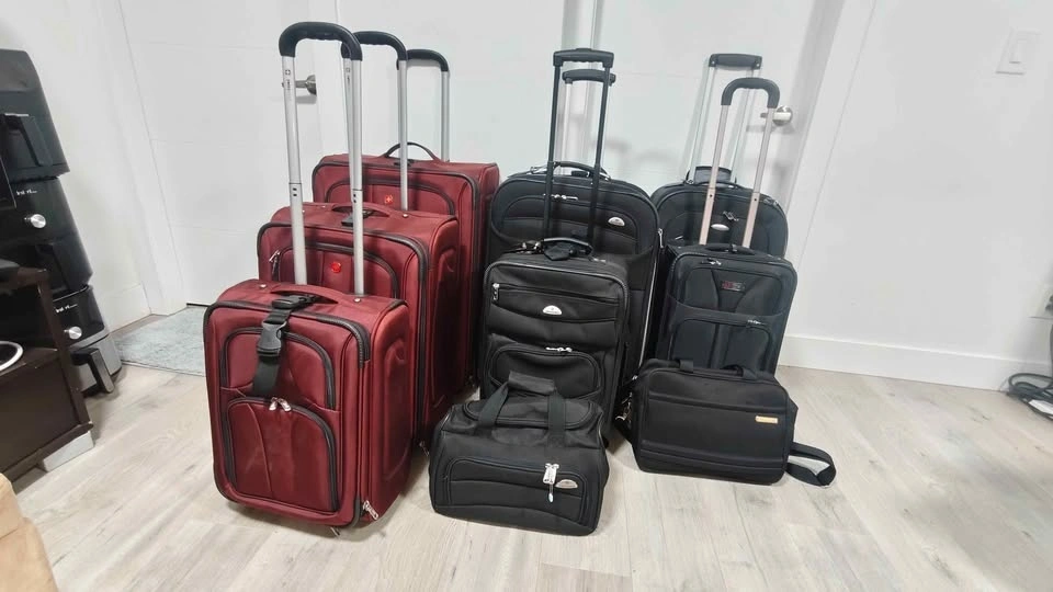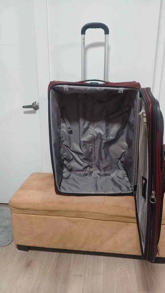 XL Red Swiss Classic suitcase with telescopic handle and wheels. Has multiple pockets and compartments. Top plastic part broke but it does not affect functionality at all. Price reflects this.