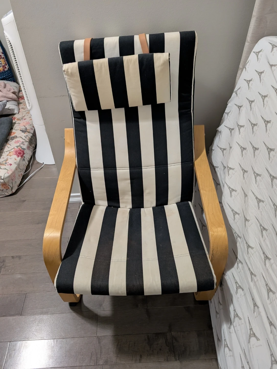 Selling a comfy IKEA Poang chair! It features a black and white striped cushion and a light wood frame. It's in great condition and ready for a new home