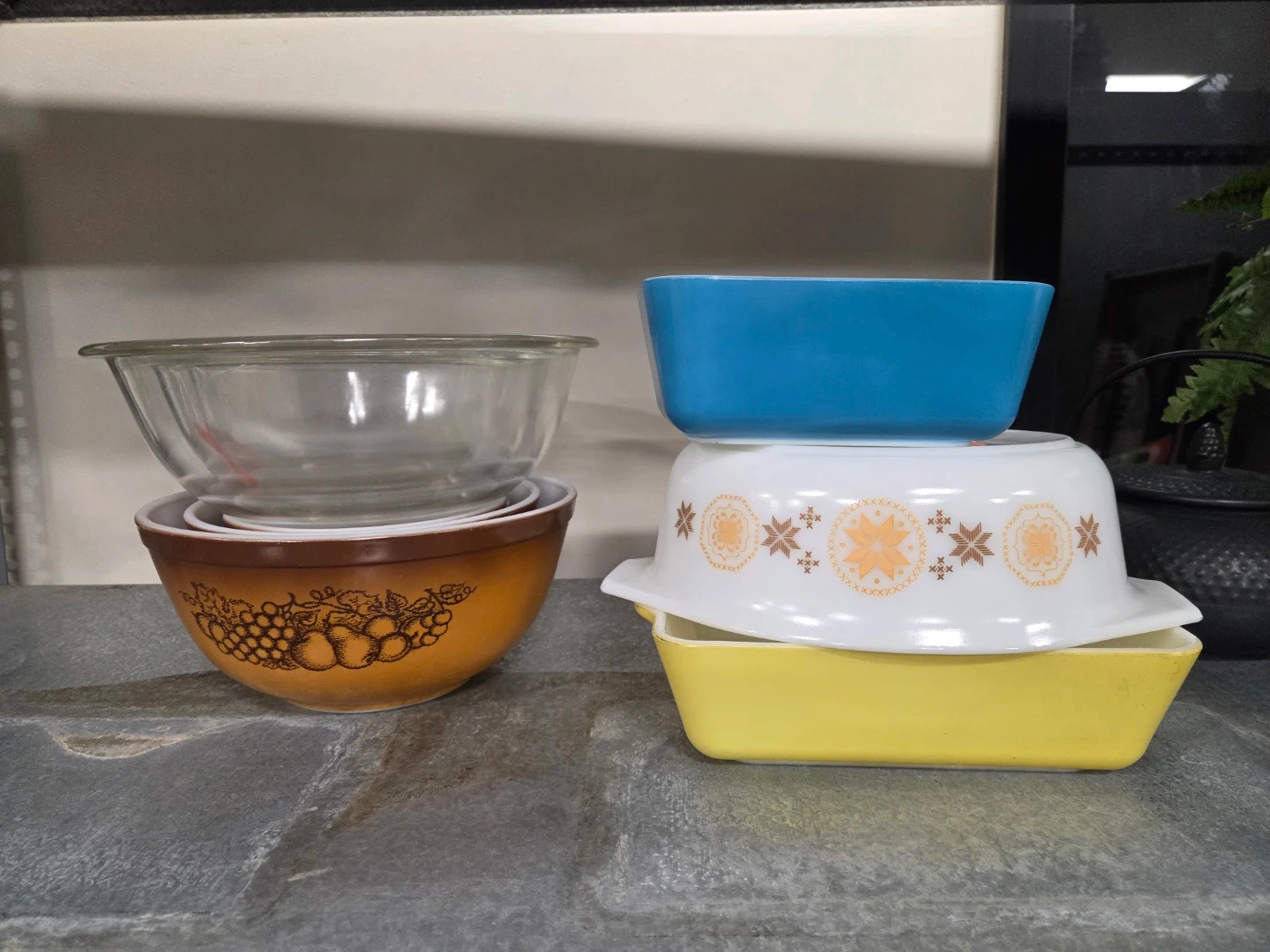 Selling a set of Pyrex bowls. They're safe for oven and microwave use. There's a clear bowl, brown bowl with a fruit pattern, blue, yellow, and white bowls