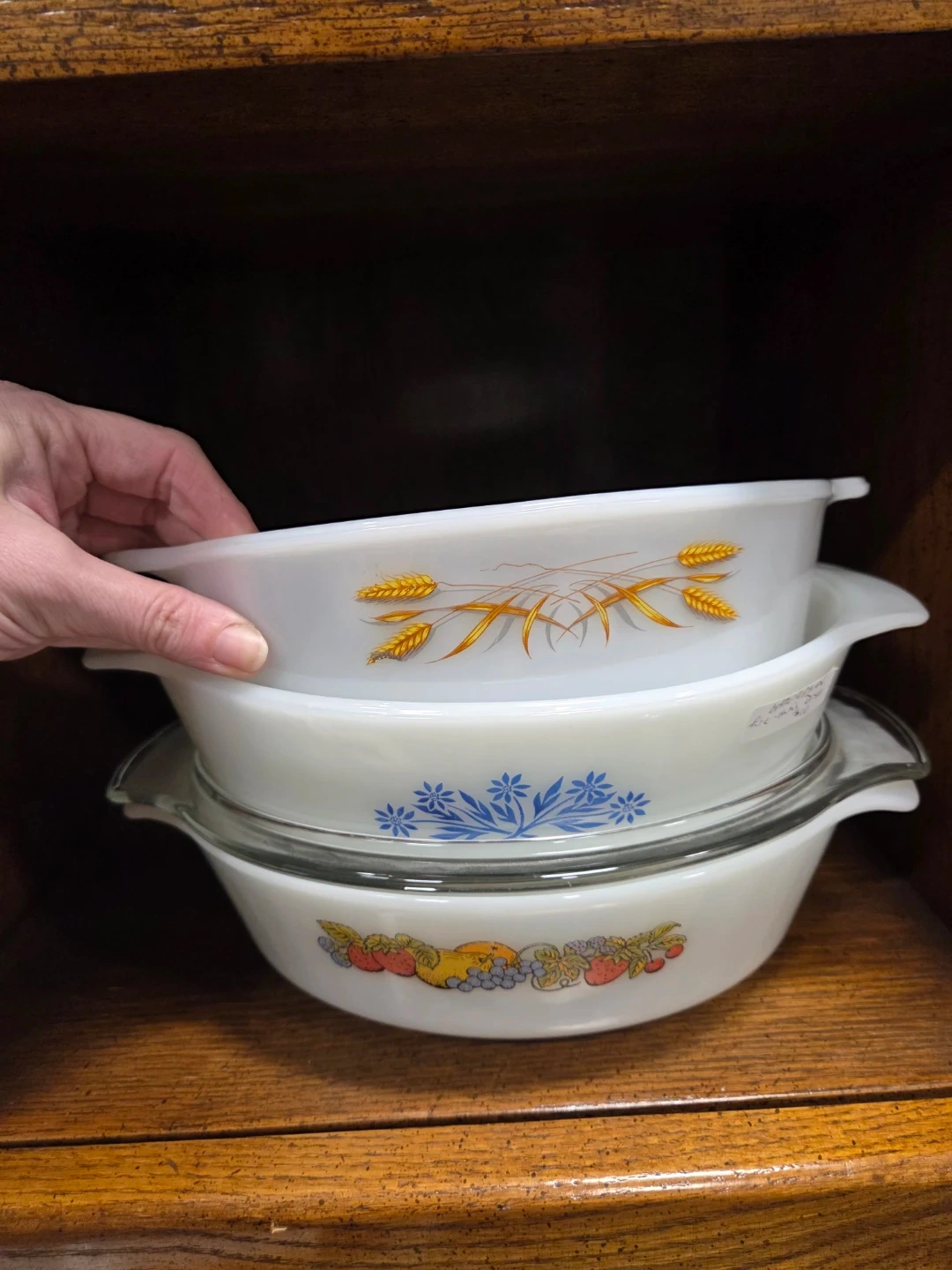 * 4 oval baking dishes (fireking and glasbake) blue Cornflower, nature's bounty, plain white milk glass plus one lid that fits 2) and fireking wheat
