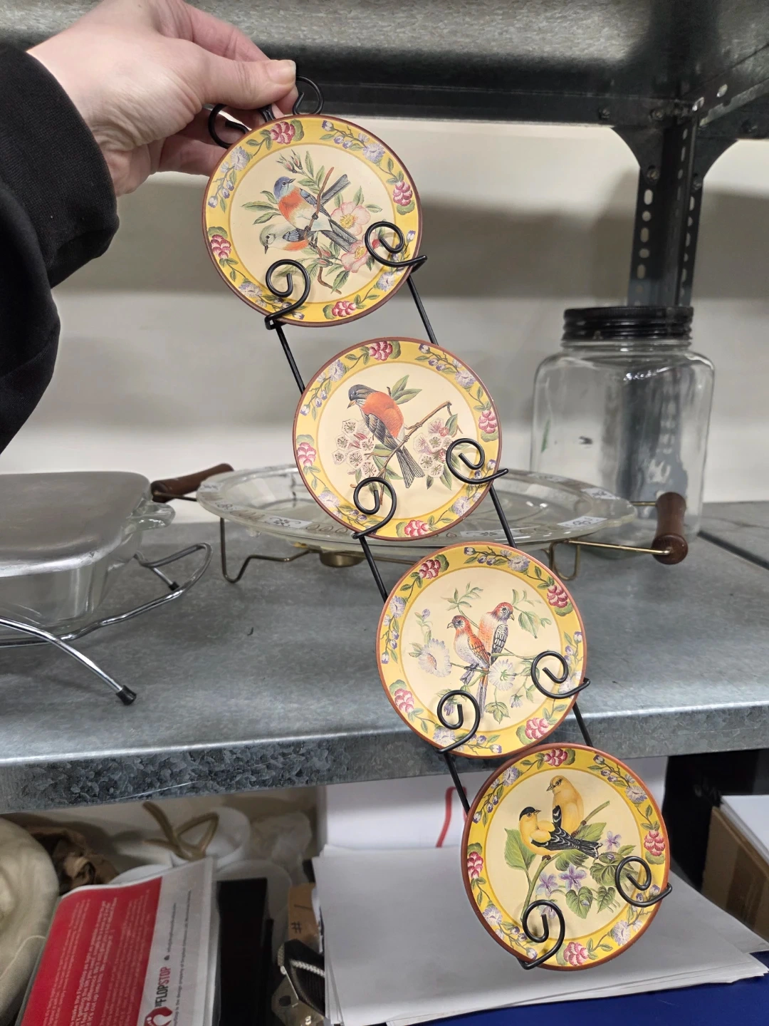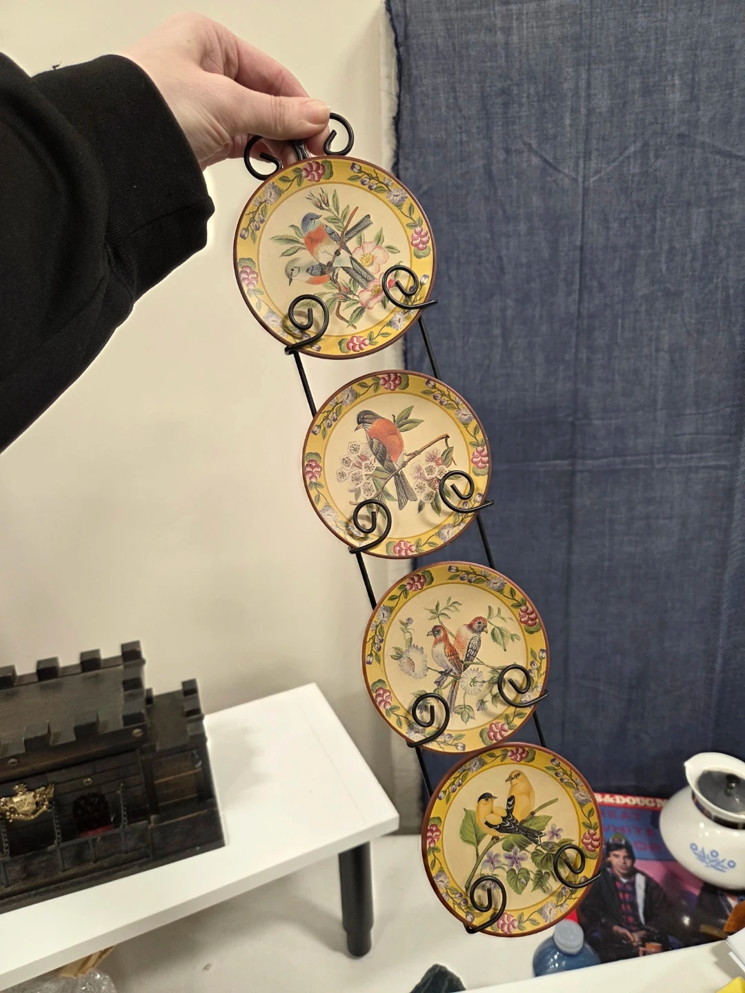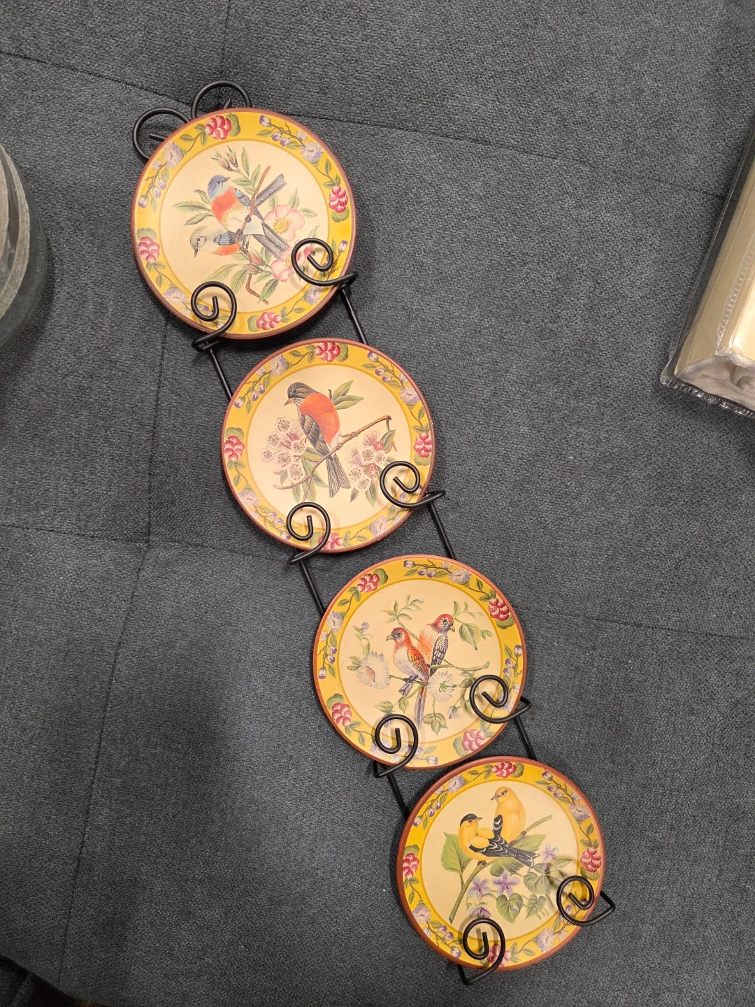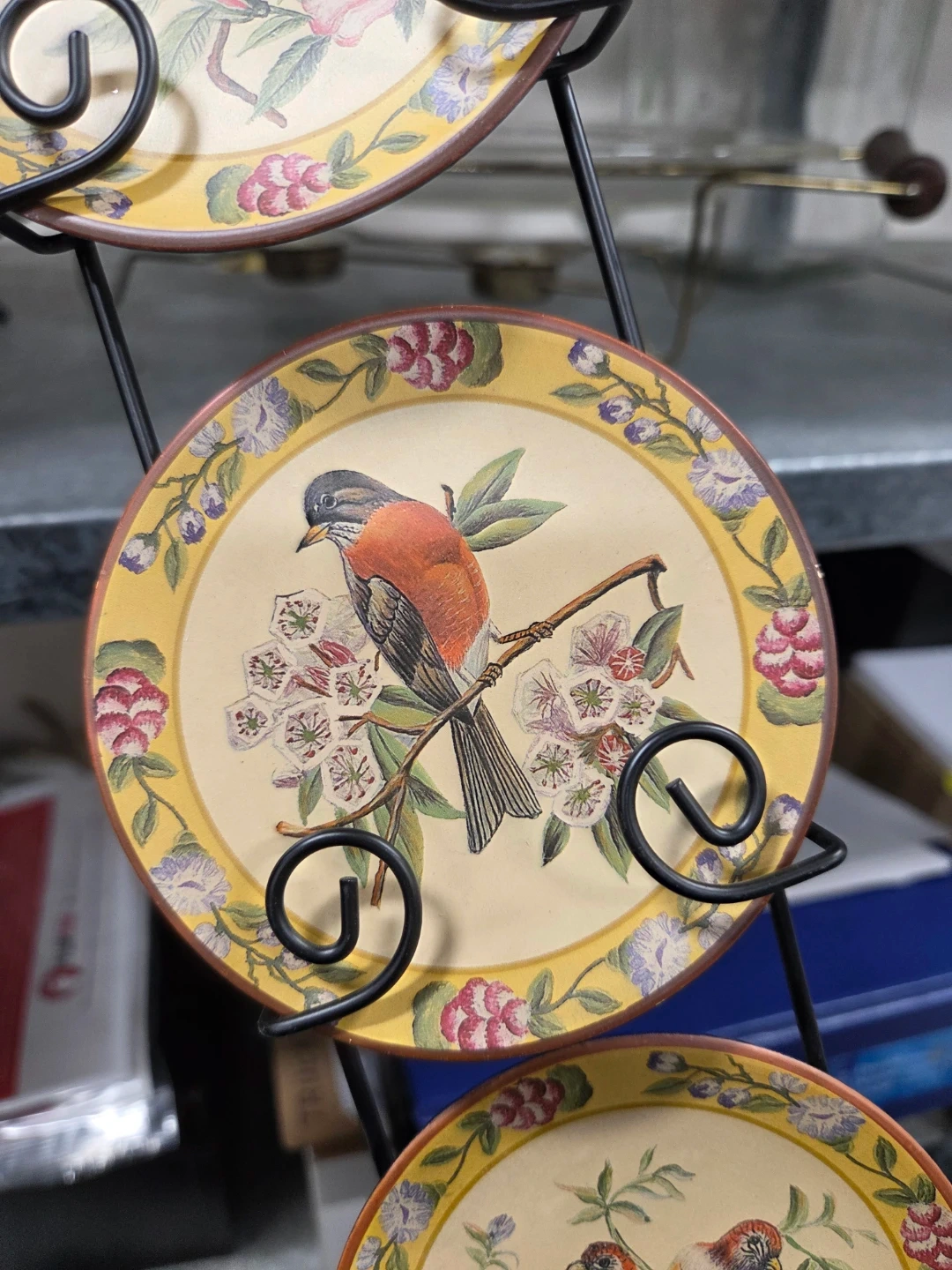 These decorative plates feature lovely bird designs and come with a metal stand for display. They would make a charming addition to any room!