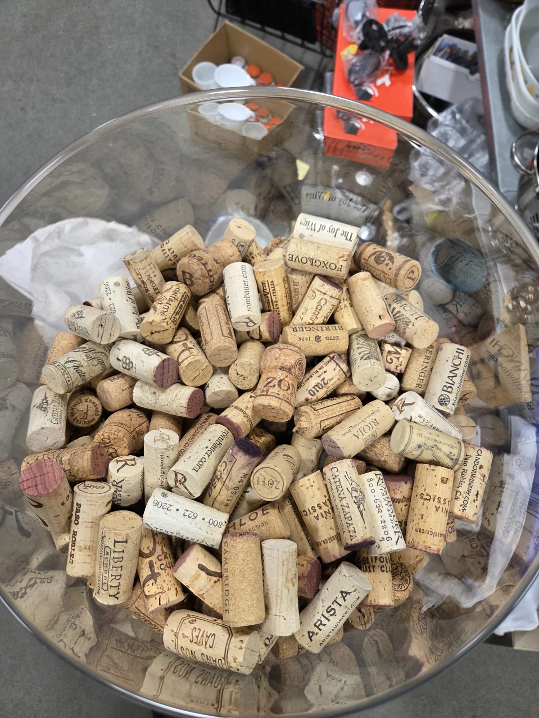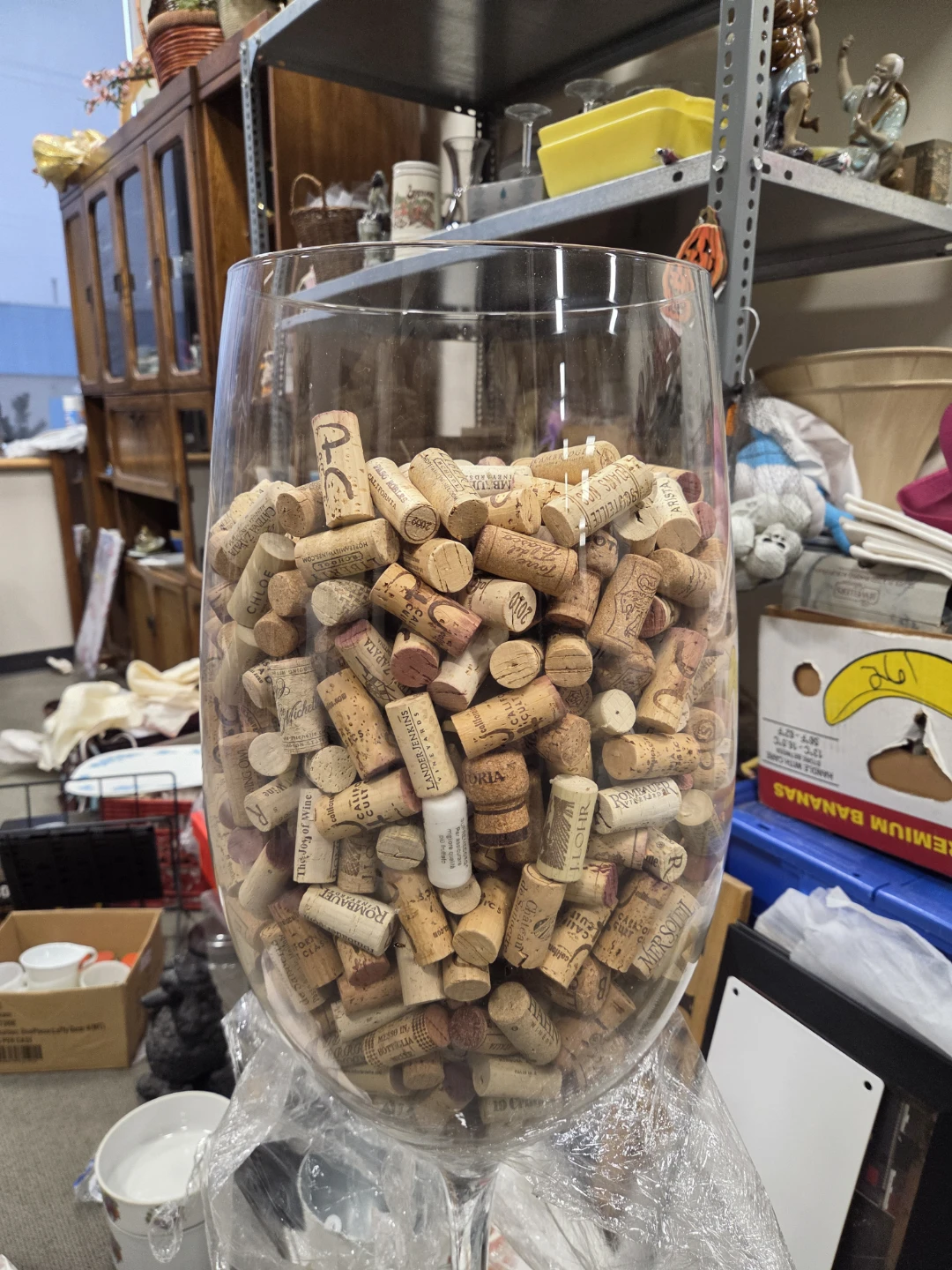 Selling a large wine glass filled with wine corks! It's a unique decorative piece that would look great in a home bar or wine cellar. The glass is in good condition and the corks add a rustic touch. Handmade glass.