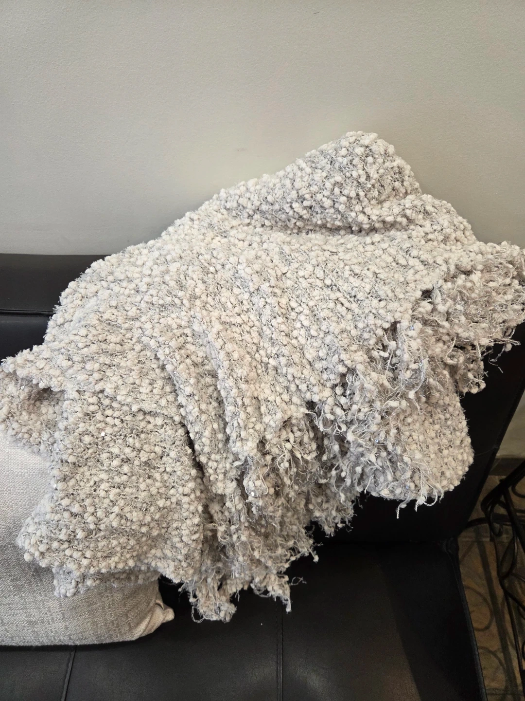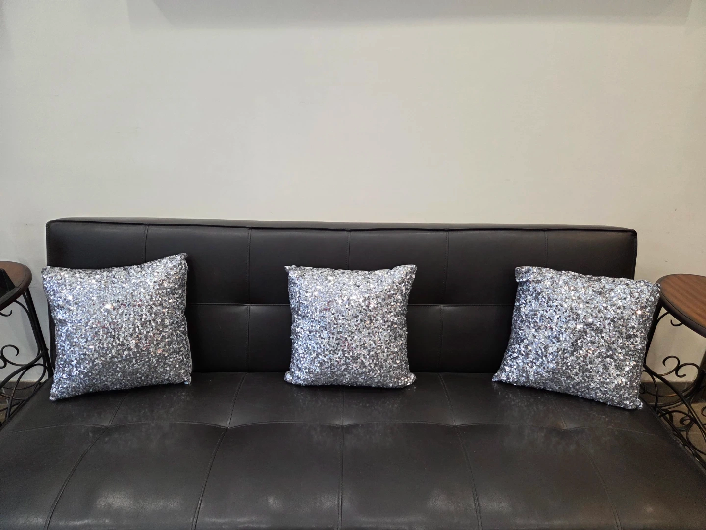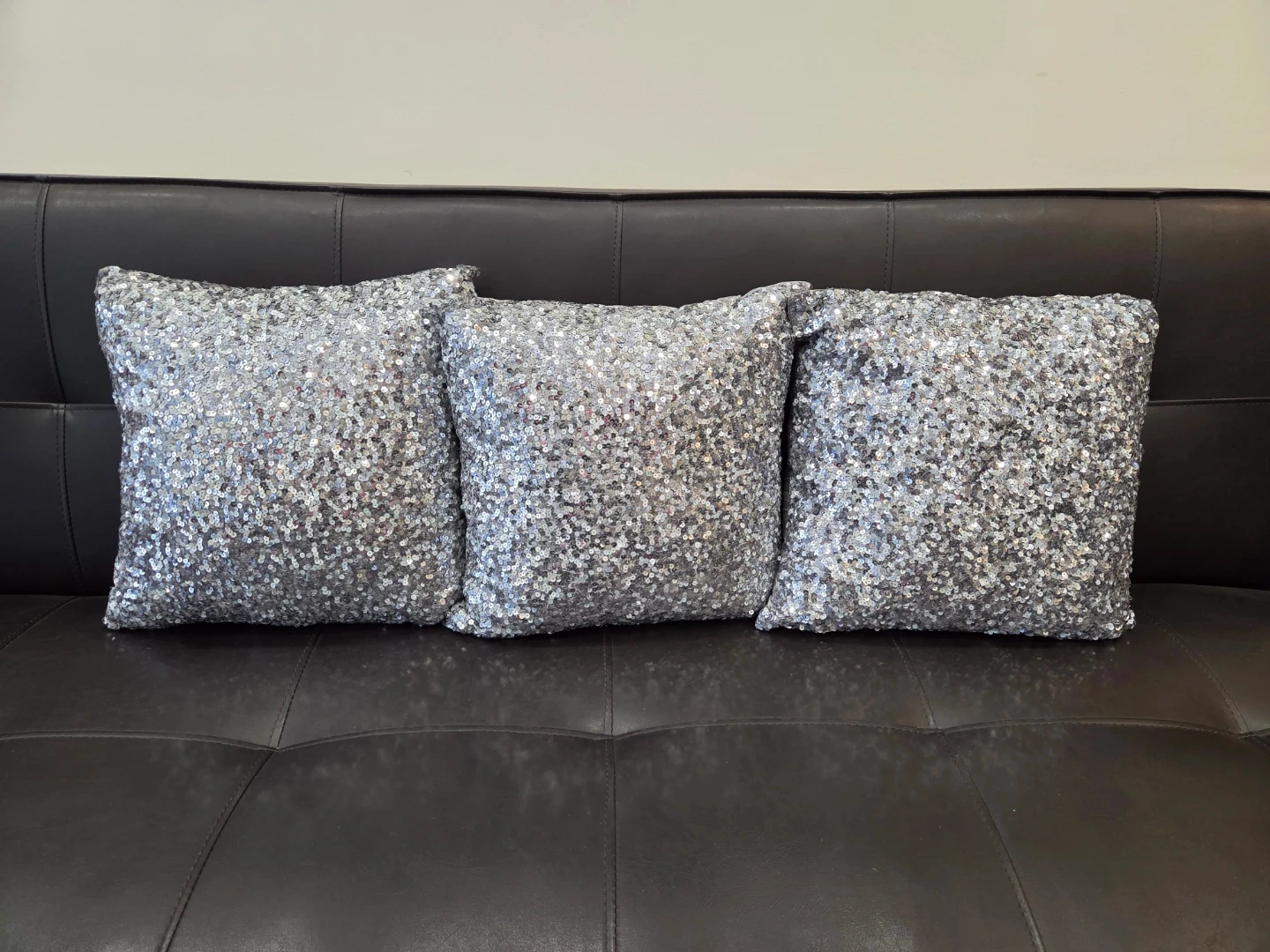 I'm selling three silver sequin throw pillows and a grey throw blanket. They're in great condition and would add a touch of sparkle and warmth to any room! The throw blanket has a unique texture of soft puff balls and hidden sequins . Very nice .