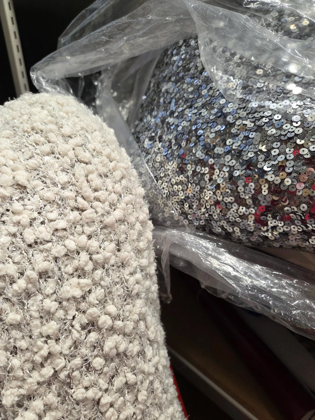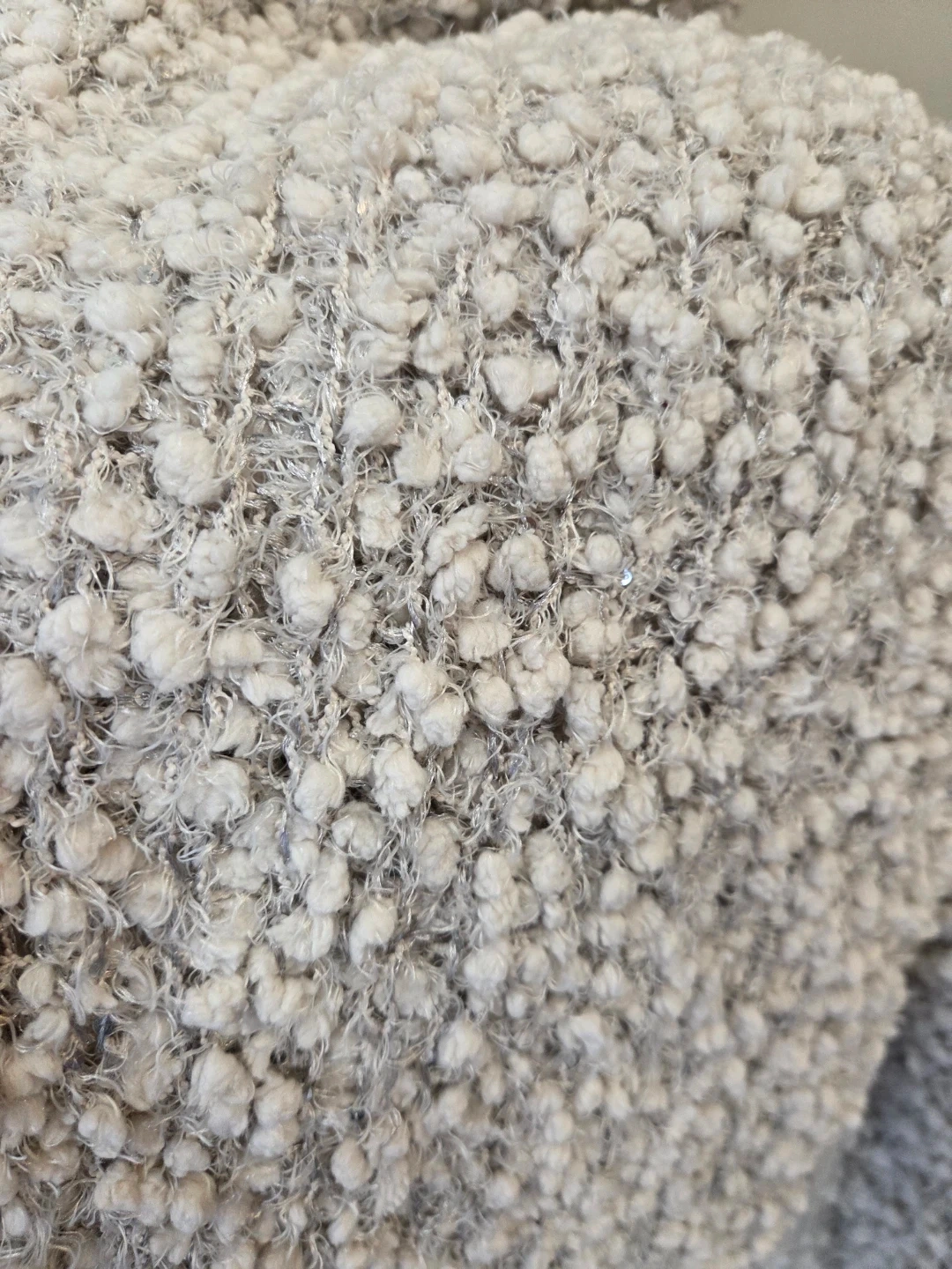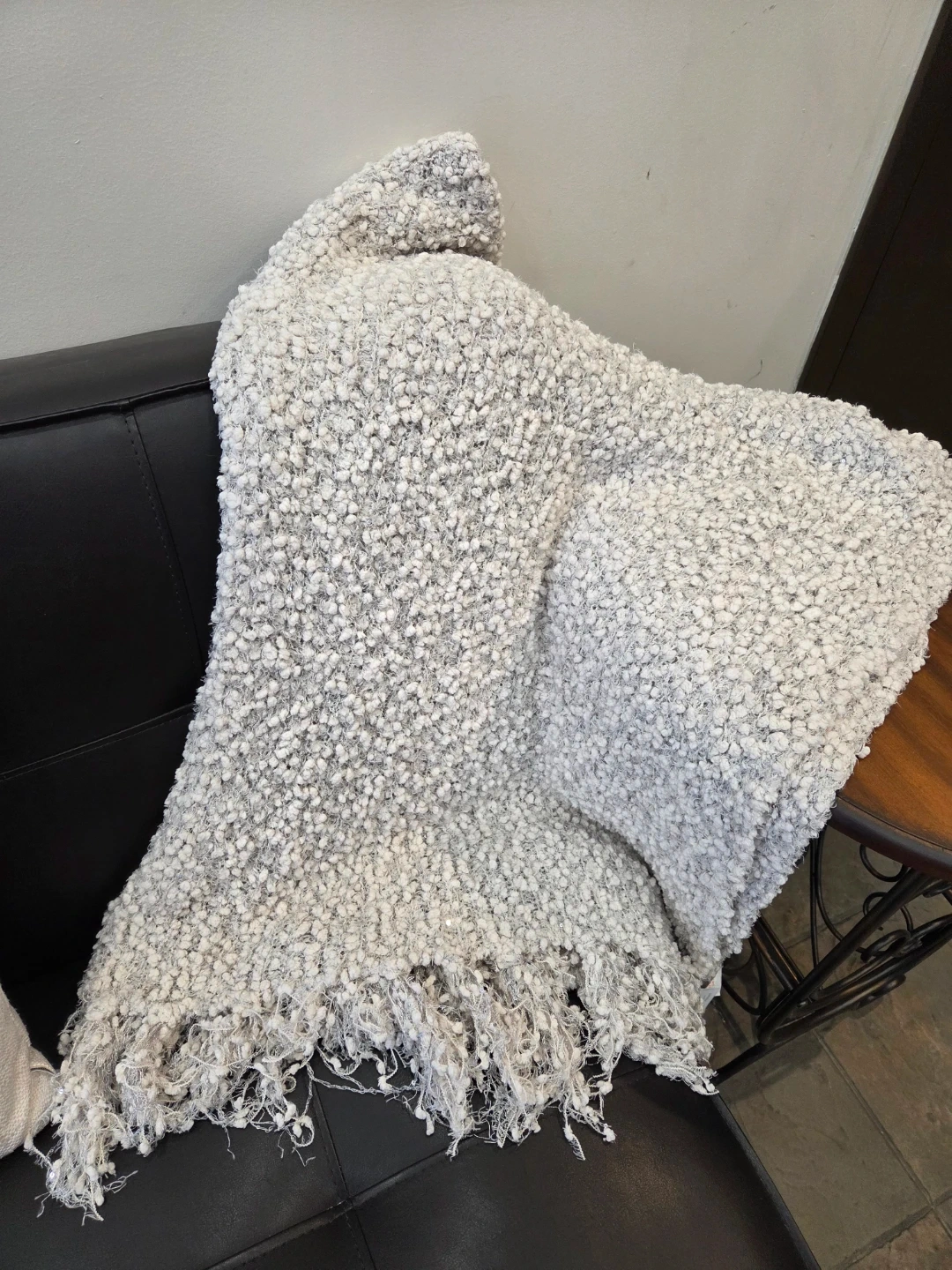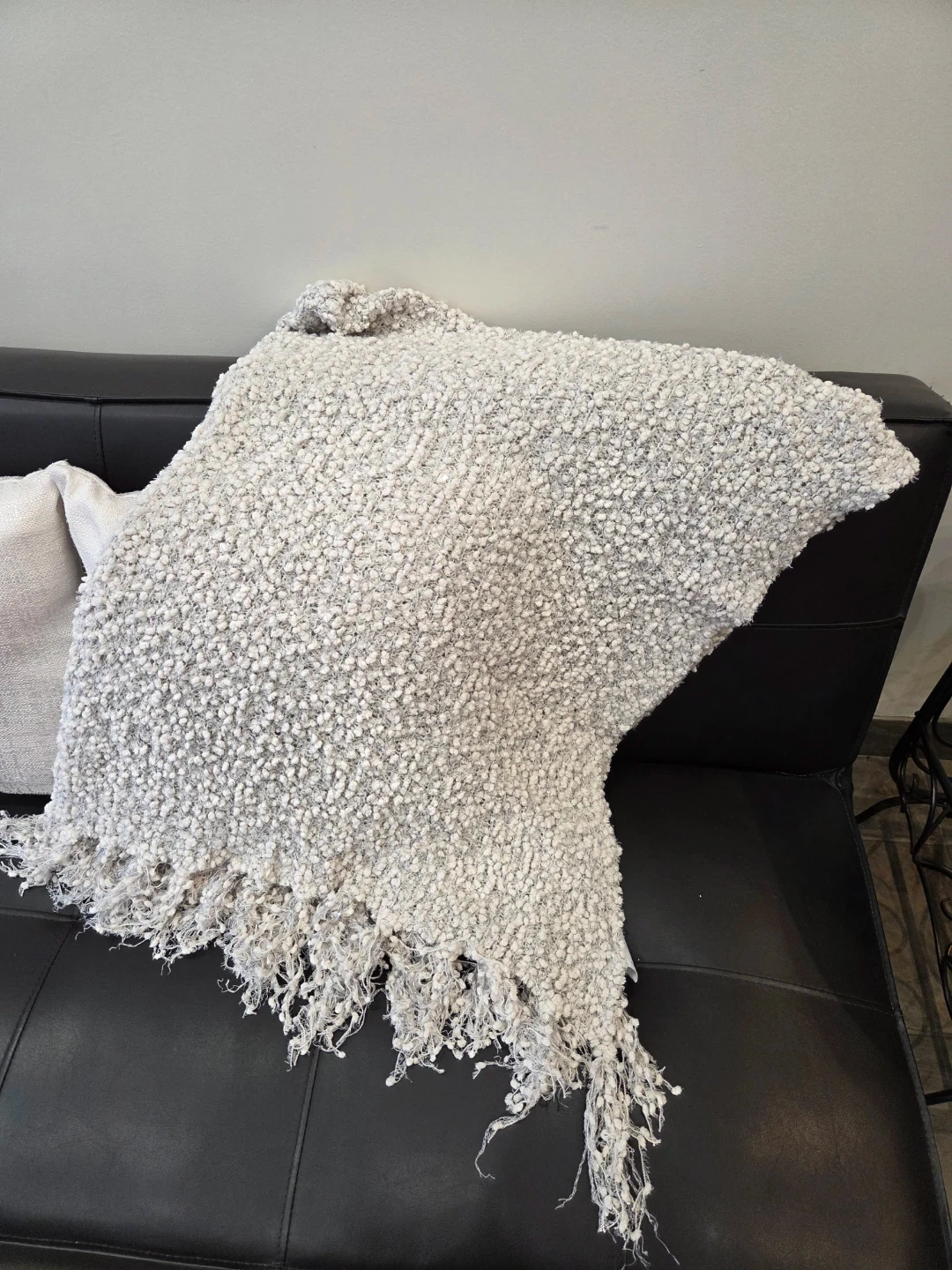 I'm selling three silver sequin throw pillows and a grey throw blanket. They're in great condition and would add a touch of sparkle and warmth to any room! The throw blanket has a unique texture of soft puff balls and hidden sequins . Very nice .