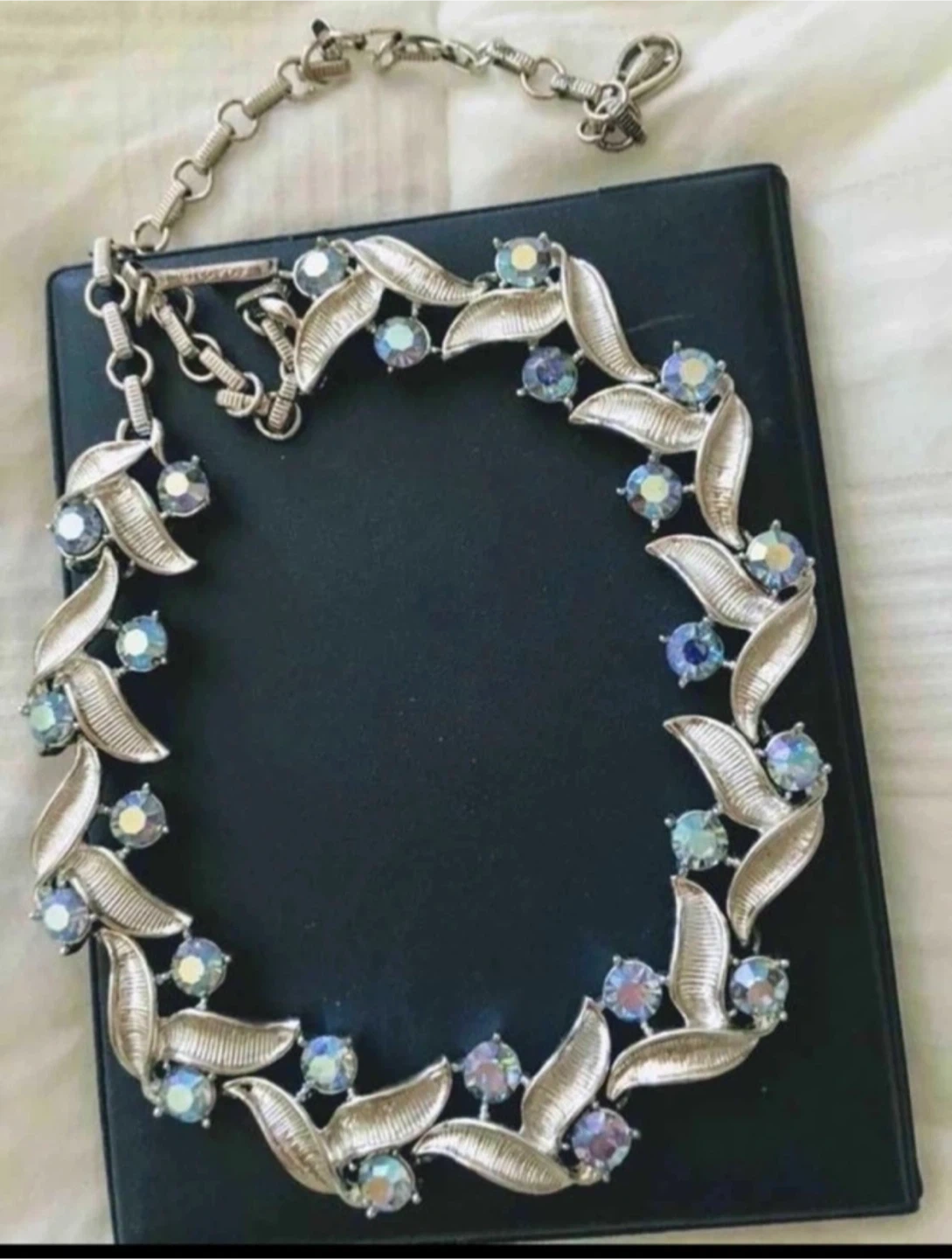 Vintage CORO necklace featuring silver-tone leaves and aurora borealis stones. This piece adds a touch of elegance to any outfit!