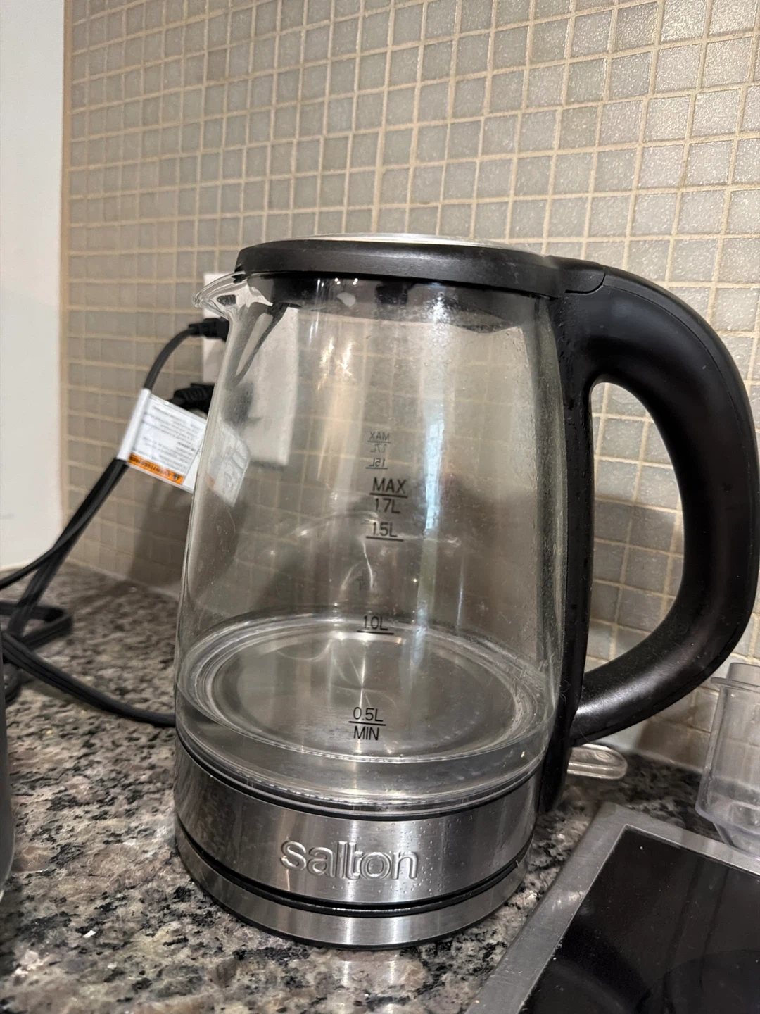 Selling a Salton electric kettle. It's a glass kettle with a black handle and base. It has markings for water levels. Perfect for making tea or coffee!