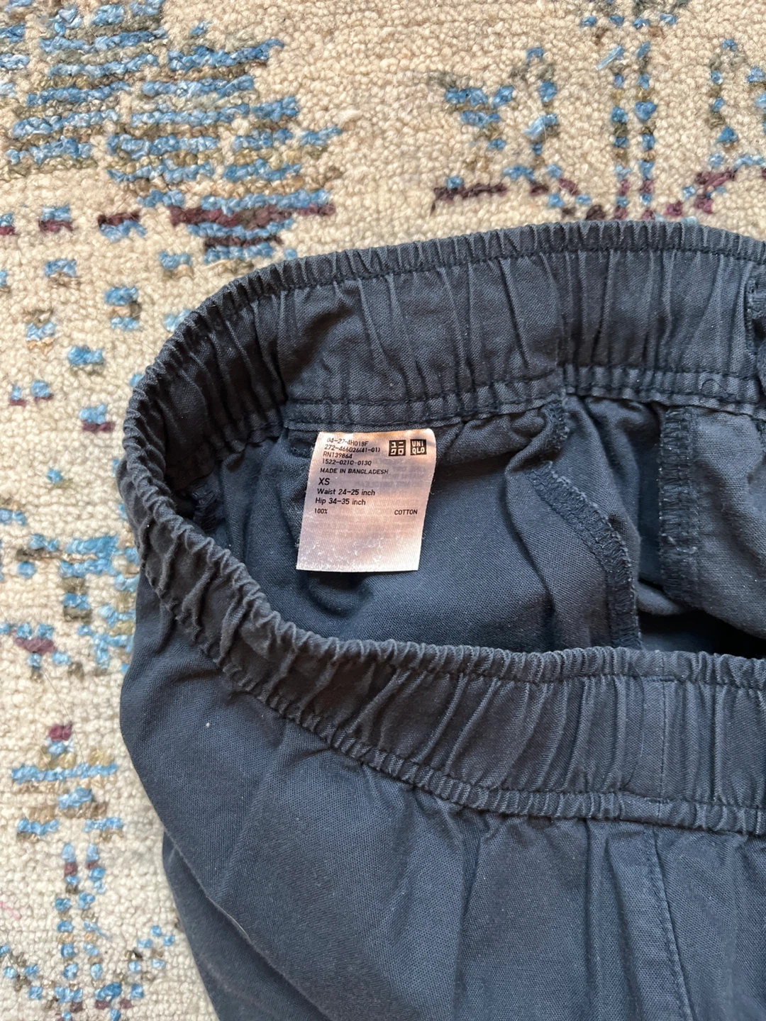 These are a pair of Uniqlo pants in size XS for petite women! They're navy blue and made of 100% cotton. The waist measures 24-25 inches, and the hips measure 34-35 inches