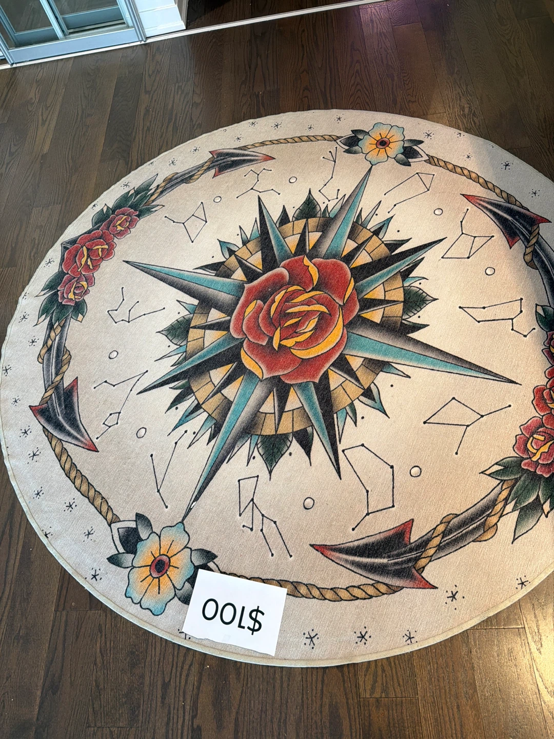 Selling a unique round rug featuring a compass rose design. It has a nautical and slightly vintage feel with roses and constellation patterns. The rug is in good condition and would be a great addition to a themed room or as a statement piece!