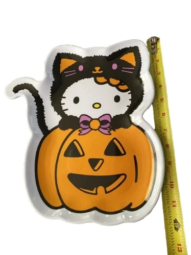 NEW, UNUSED. The plate features Hello Kitty in a pumpkin dressed as a black cat. Material is a durable melamine. This item is marketed for Halloween-themed decoration or serving food at parties. SIZE: 12" Tall