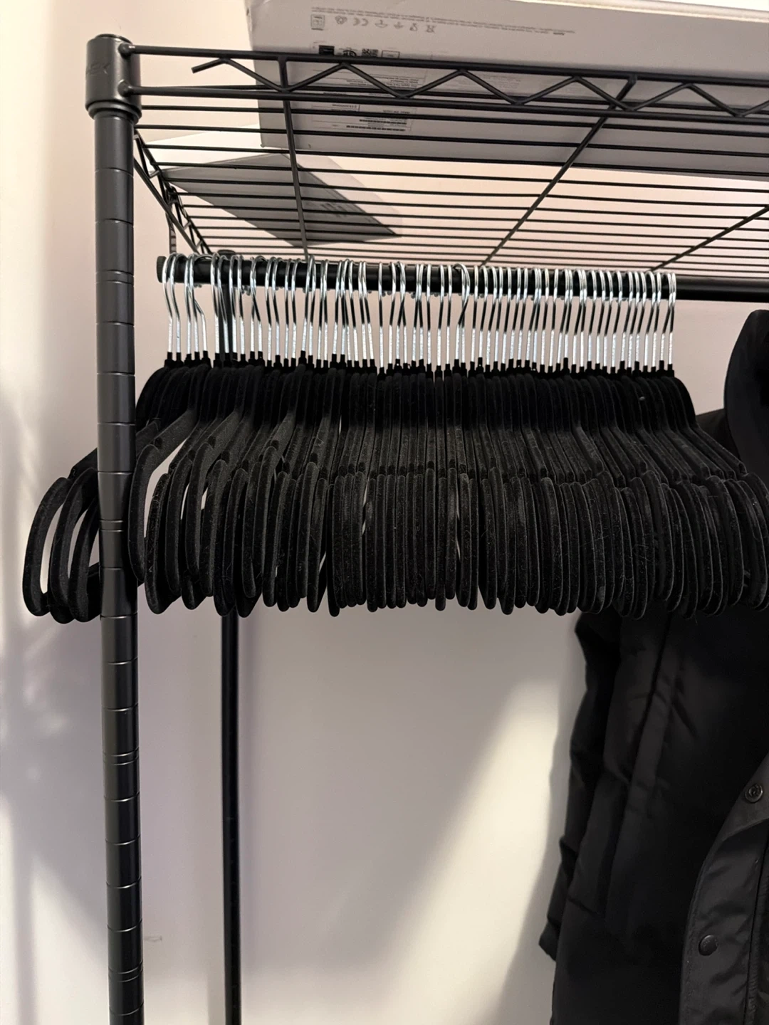 Selling a over 100 of black velvet clothes hangers! They're in great condition and will help keep your clothes from slipping. Perfect for organizing your closet and saving space