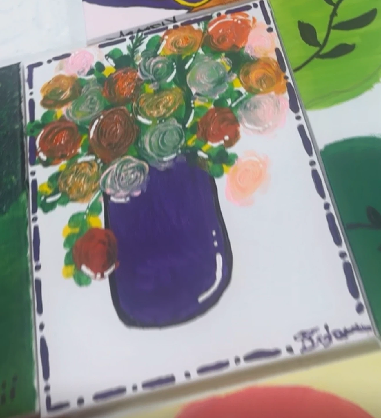 I have a handmade floral painting for sale! The painting features a vibrant bouquet of flowers in a purple vase. It's a unique piece that would add a touch of charm to any room