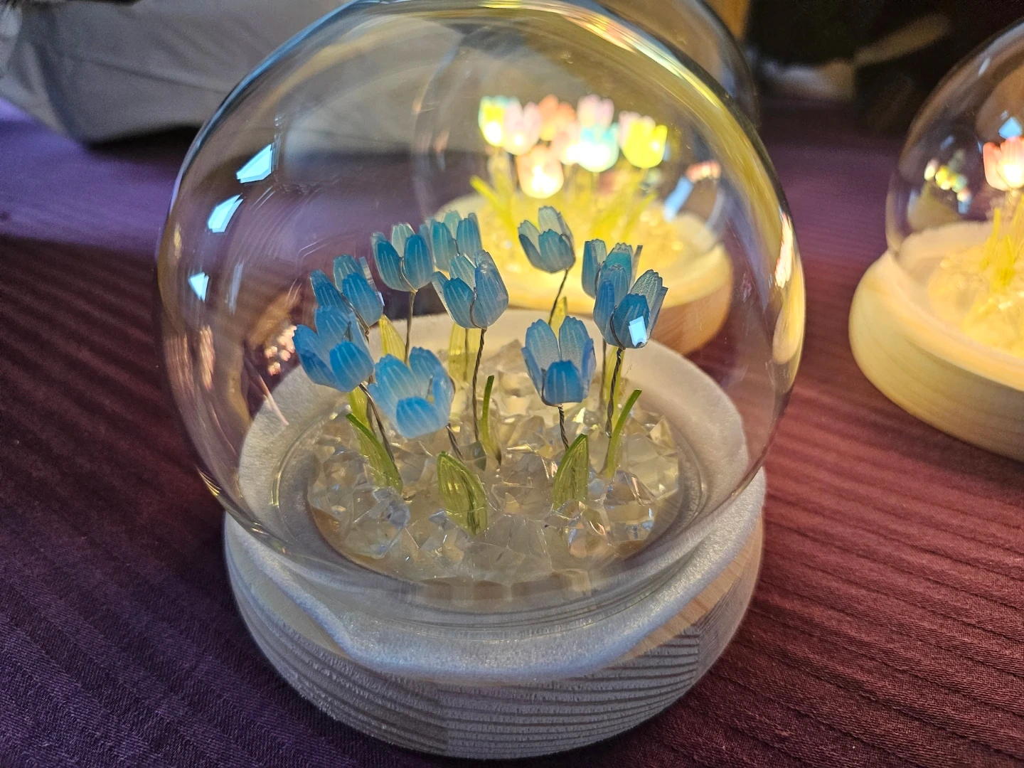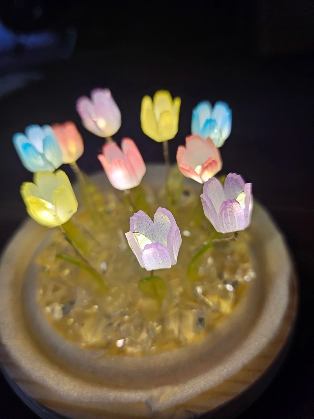Add a touch of whimsy to your space with these adorable tulip flower LED night lights! They come in a variety of colours, encased in a glass dome on a wooden base. Perfect for creating a cozy atmosphere in any room, great as a cute gift also.