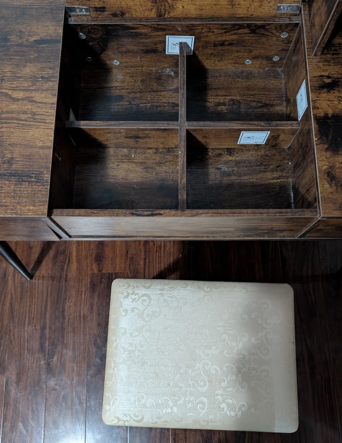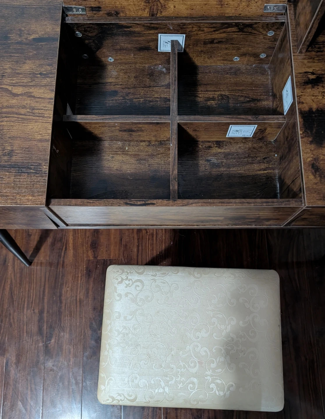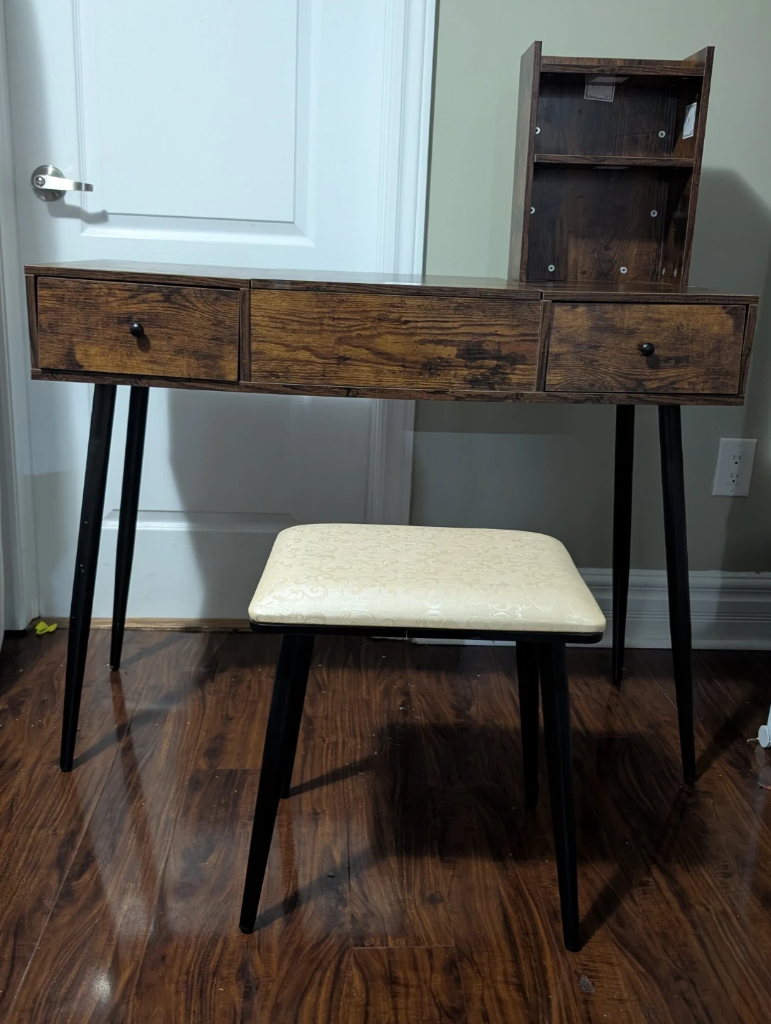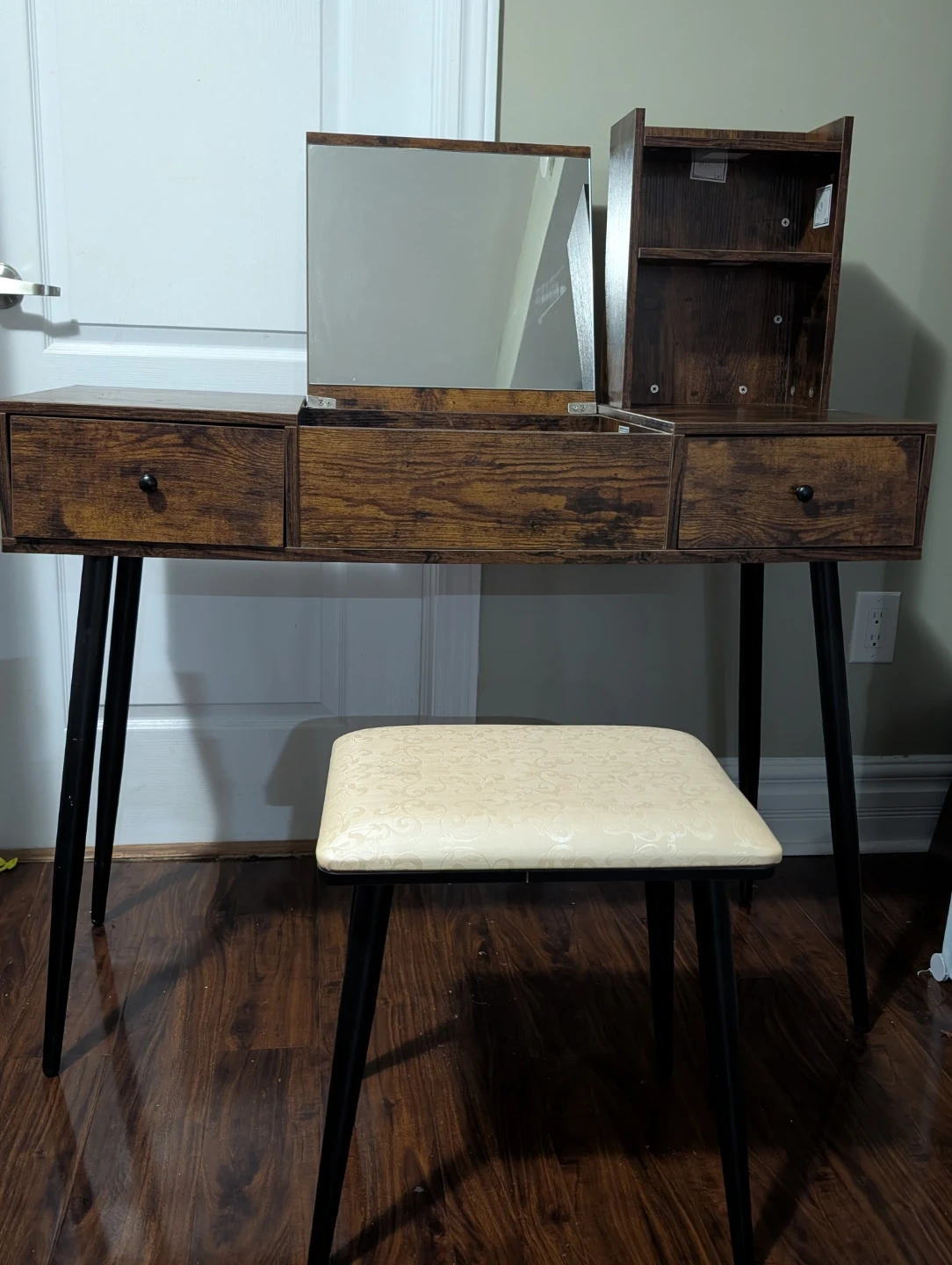 Selling a vanity table with a matching stool. It features a flip-top mirror and storage compartments, perfect for organizing your makeup and accessories. The set has a rustic wood finish with black legs, adding a touch of elegance to any room!