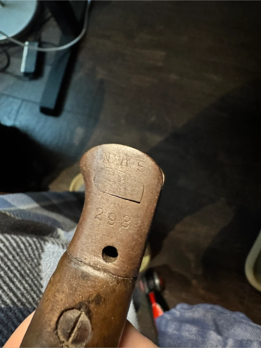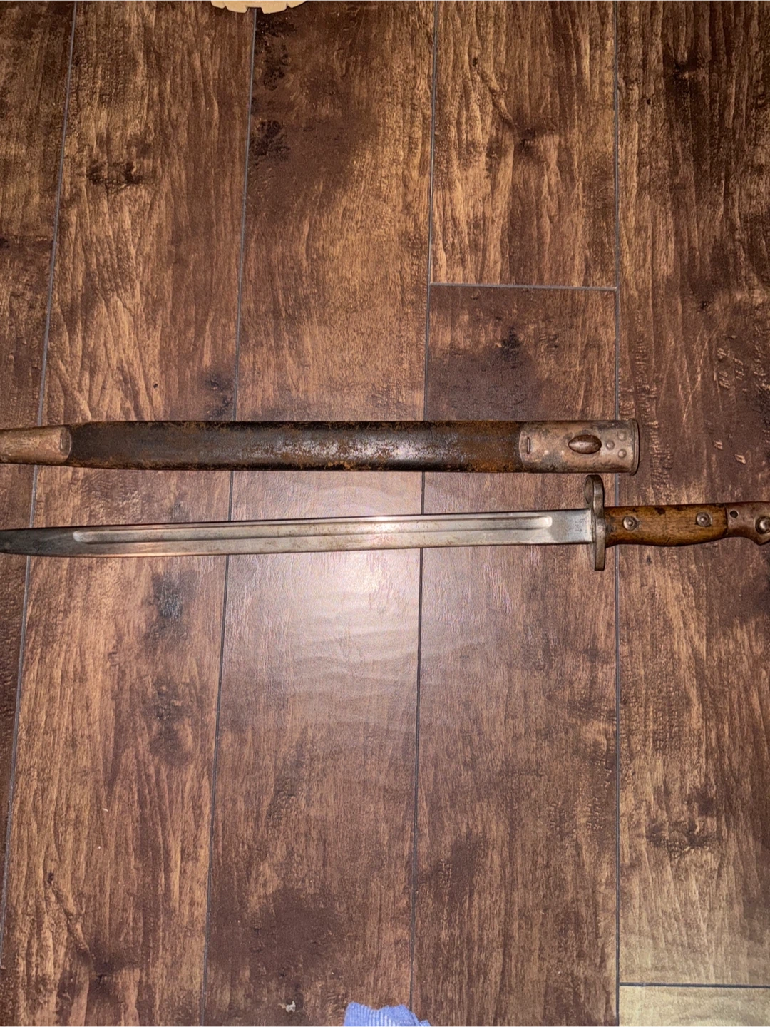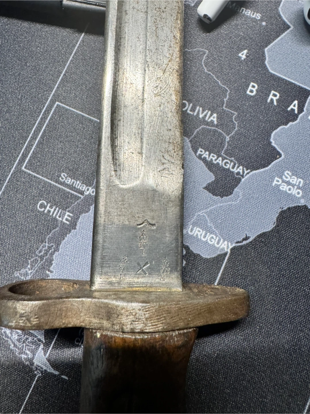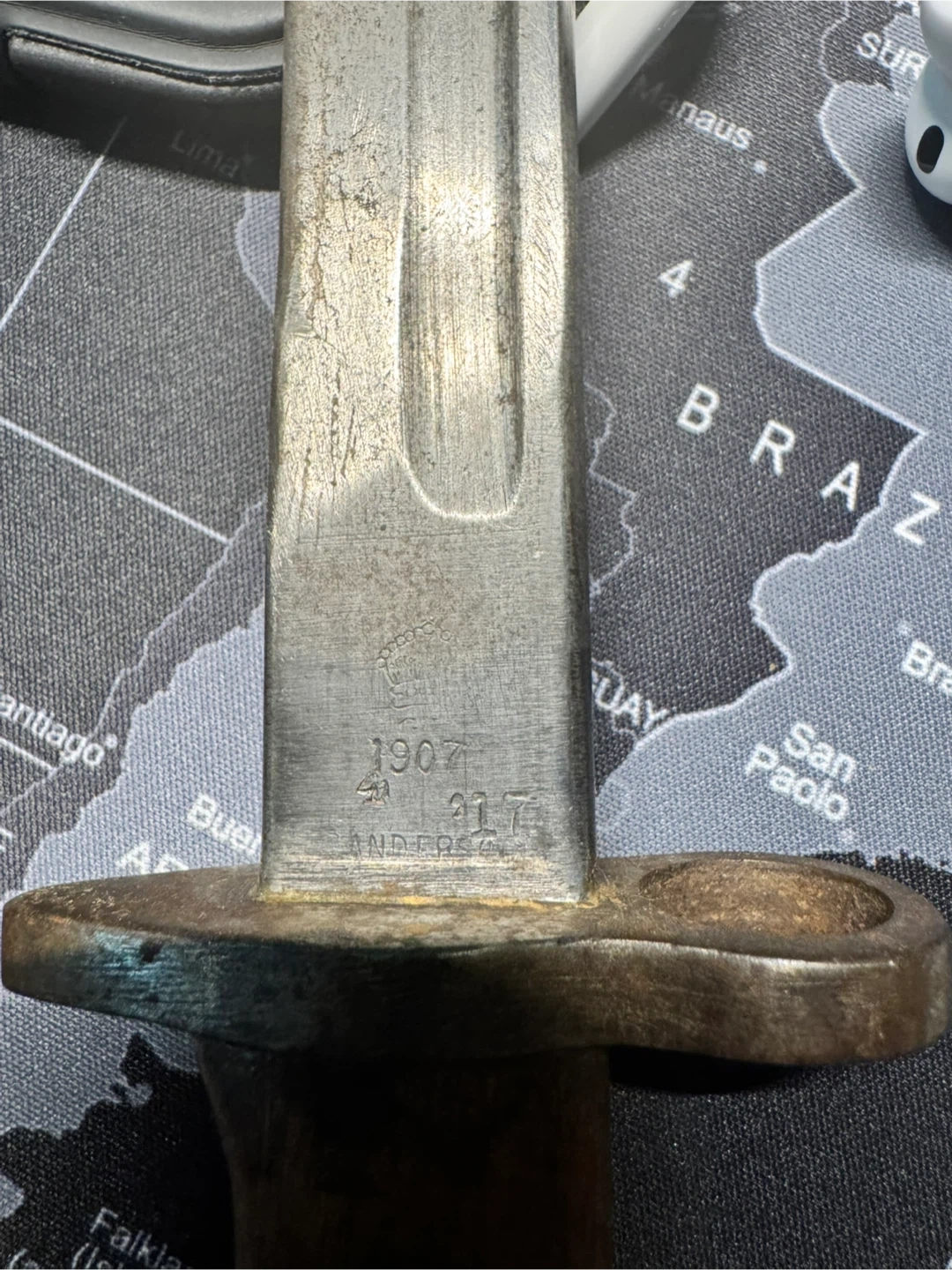 The bayonet was originally made from Sanderson in 1917 (WWI era), and it was inspected by enfield. The bayonet ended its service in Canadian naval radio section (NRS).