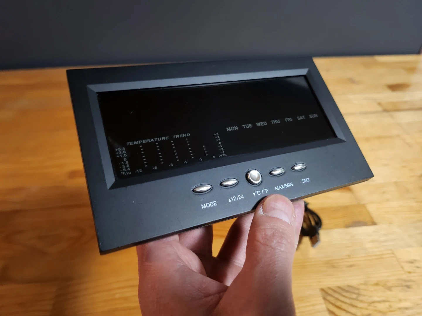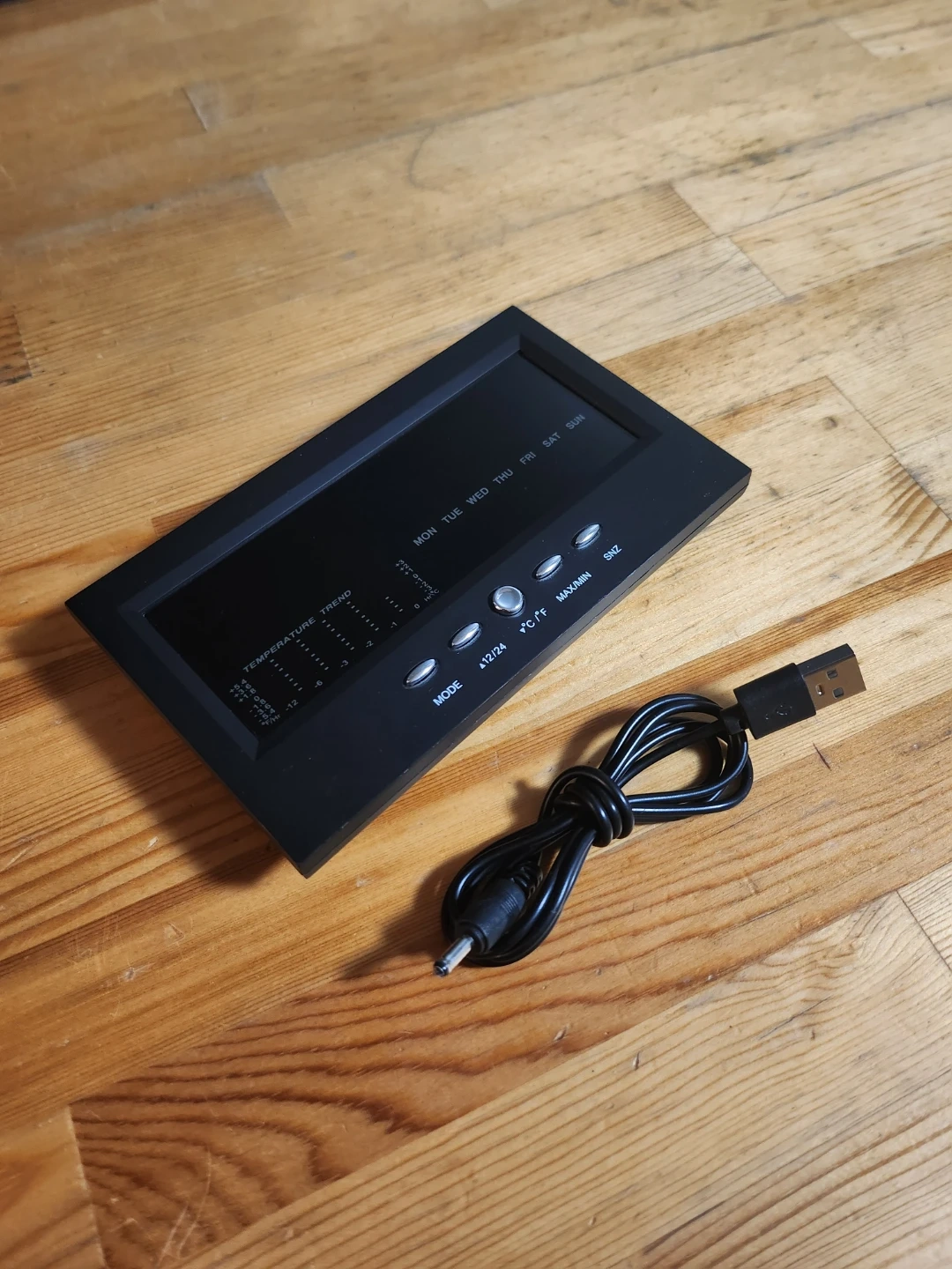 Multifunctional digital LCD weather station alarm clock. It is a versatile desktop tool that provides real-time environmental data alongside standard timekeeping functions.