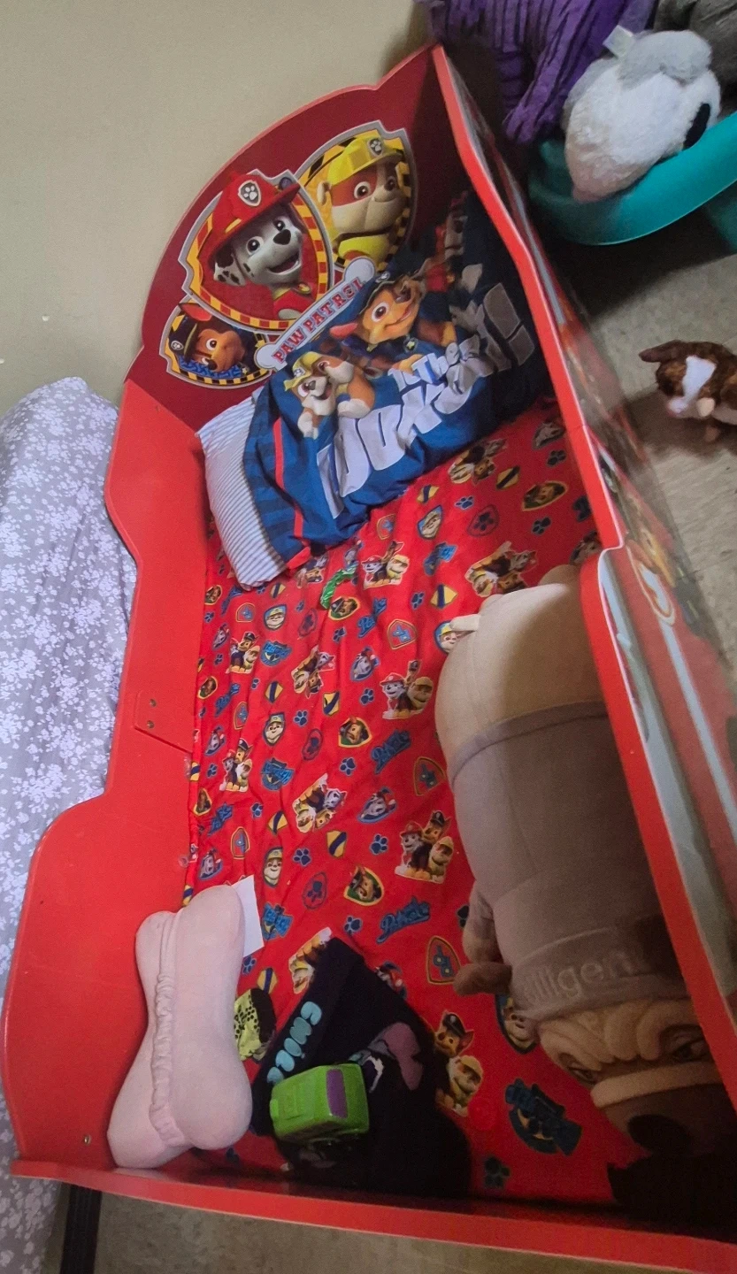 Selling a Paw Patrol Fire Truck toddler bed! It's in good condition and ready for a new home. Perfect for transitioning your little one from a crib to a bed. The bright red color and fun design will make bedtime exciting for any Paw Patrol fan