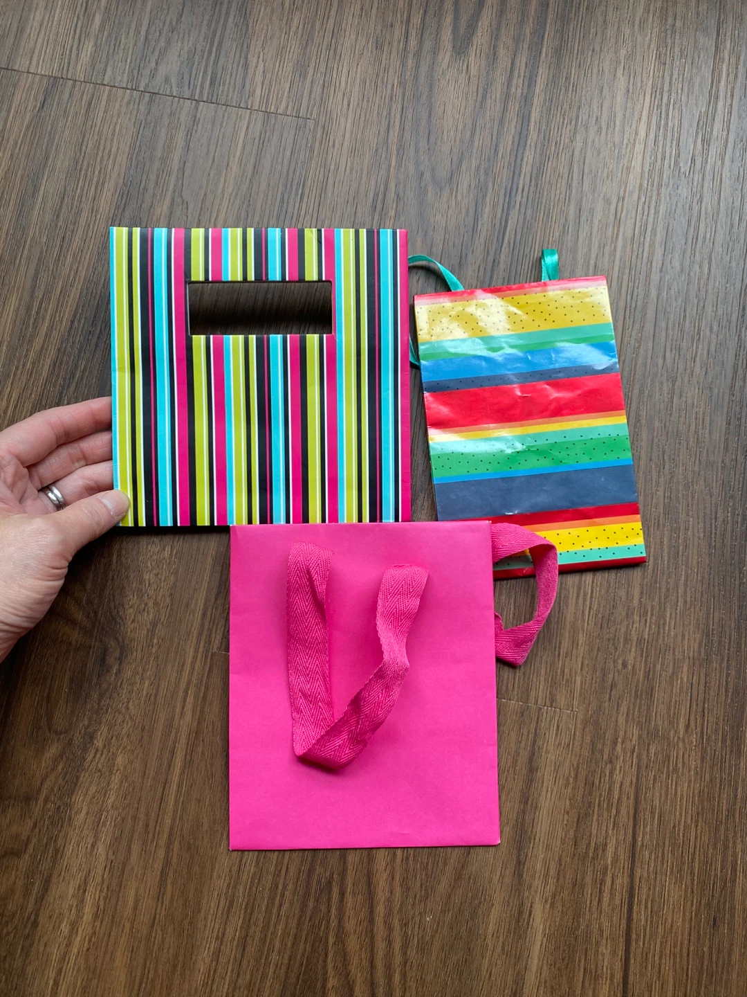 Selling a set of three colourful gift bags. They come in various patterns, perfect for any occasion. Good for party favours or small gifts.