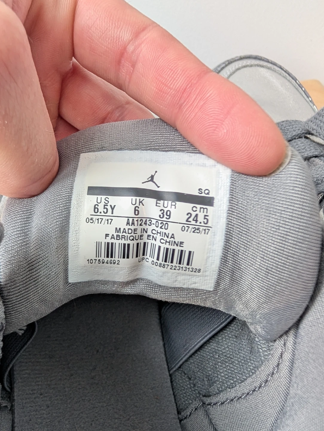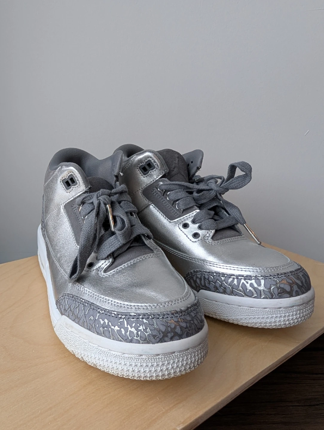 Selling a pair of Air Jordan 3 Retro sneakers in silver and grey! They feature the classic elephant print detailing and the Jumpman logo on the back. The soles are in great shape and ready for wear. A stylish addition to any sneaker collection!