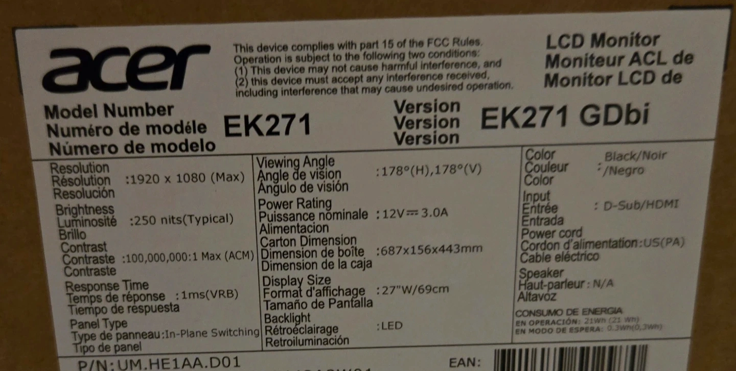 Brand new Acer EK271 GDbi 27-inch monitor, never opened and factory sealed. Purchased but never used.