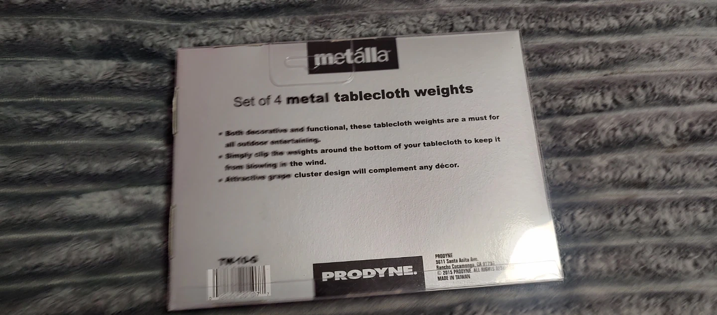 Set of 4 metal tablecloth weights by Prodyne! These are both decorative and functional, making them a must for all outdoor entertaining. Simply clip the weights around the bottom of your tablecloth to keep it from blowing in the wind. The attractive grape cluster design will complement any décor