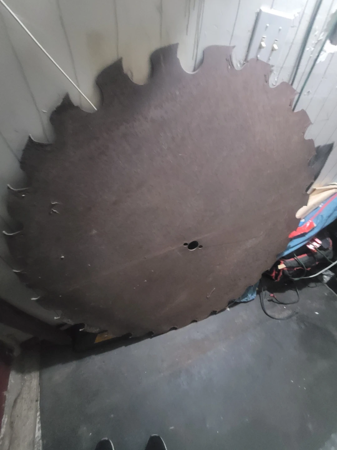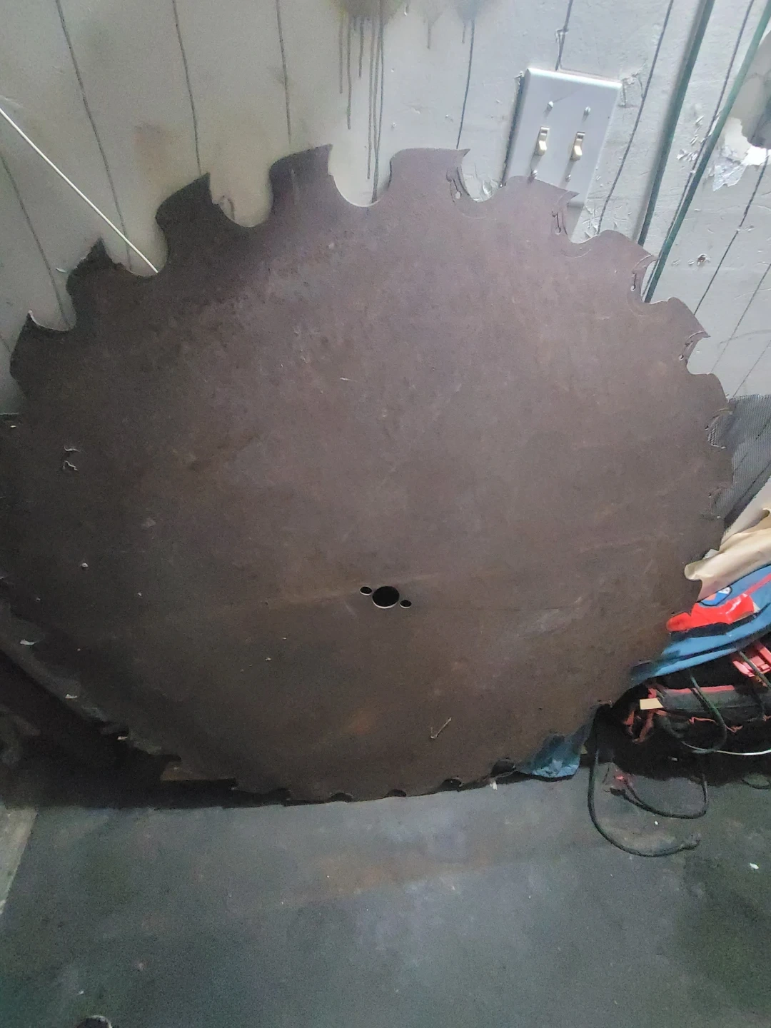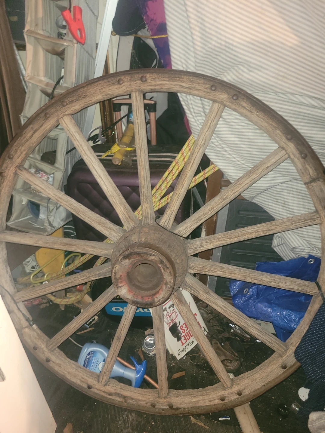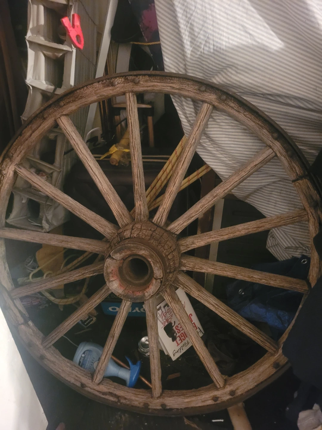 Selling a vintage wooden wagon wheel and a large saw blade. Both items show signs of wear and age, adding to their rustic charm. Great for adding a unique touch to your home or garden!