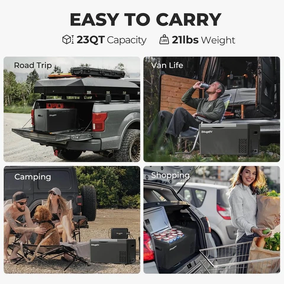 The BougeRV 12V 23-Quart Portable Travel Electric Cooler features advanced compressor technology and a compact design, ideal for on-the-go food and drink storage. It fits perfectly in your car, truck, or RV and has an easy-carry handle, making it a great companion for road trips and outdoor adventures. This fridge/freezer is brand new and has never been used.