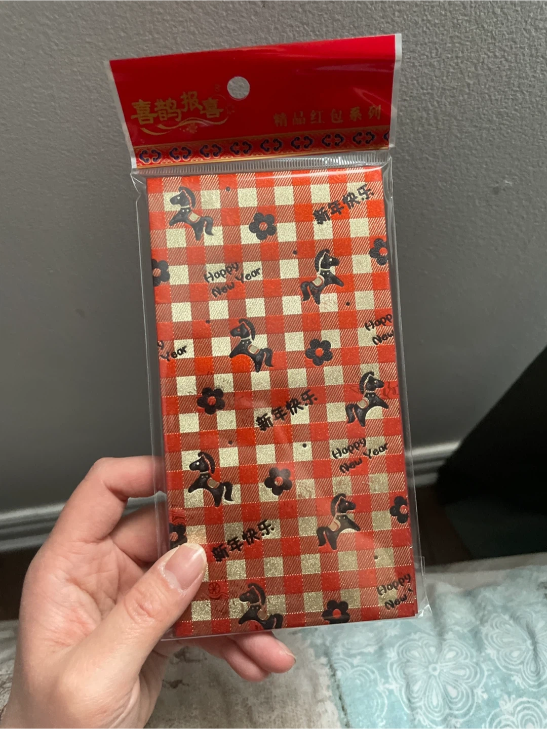 This is a set of red envelopes with a horse and flower pattern. They are printed with "Happy New Year" in English and Chinese. These envelopes are suitable for gifting during Lunar New Year celebrations.