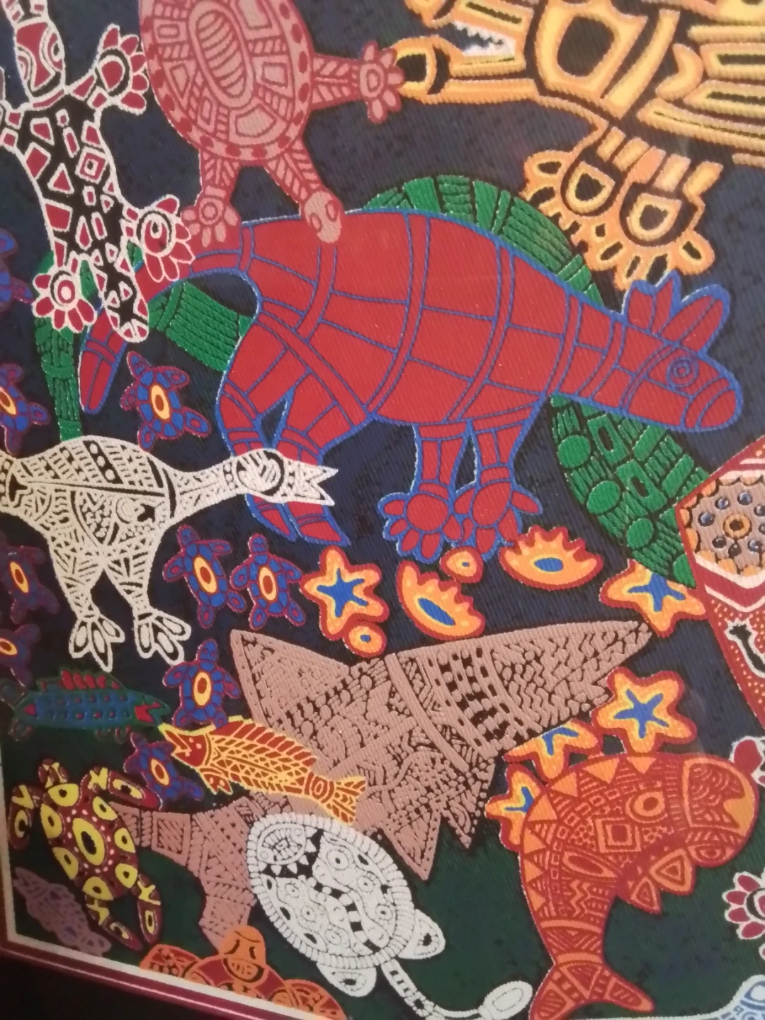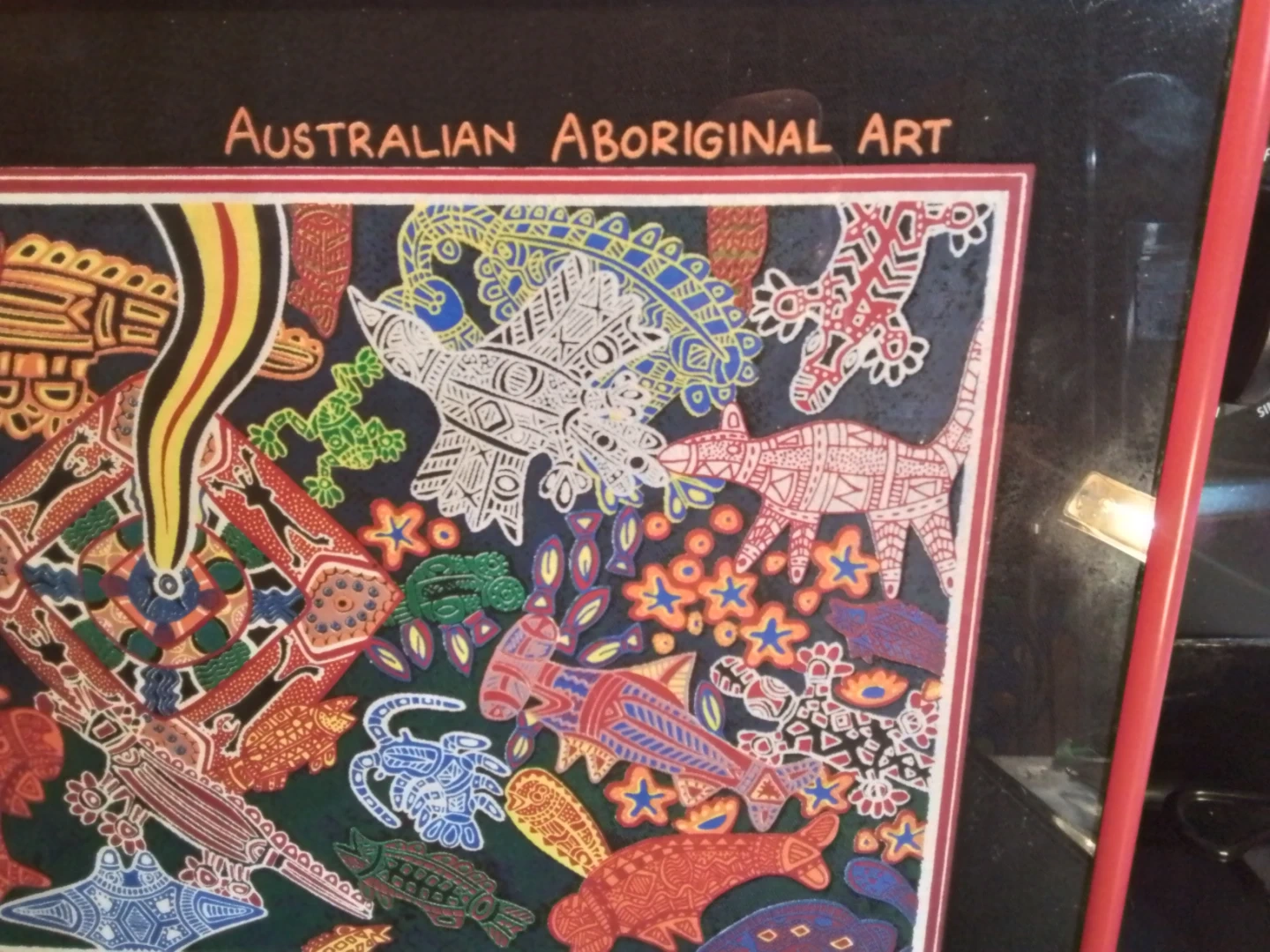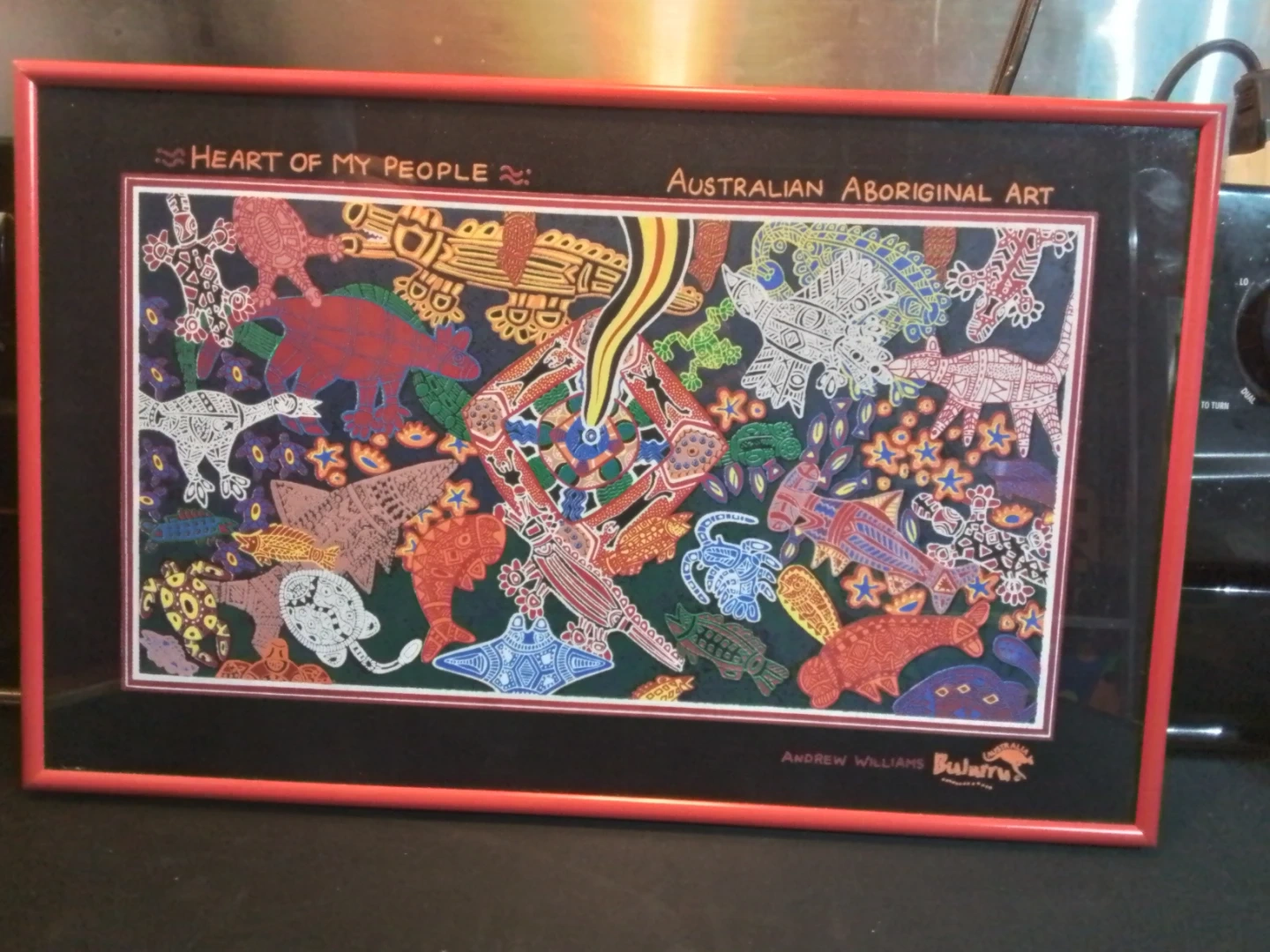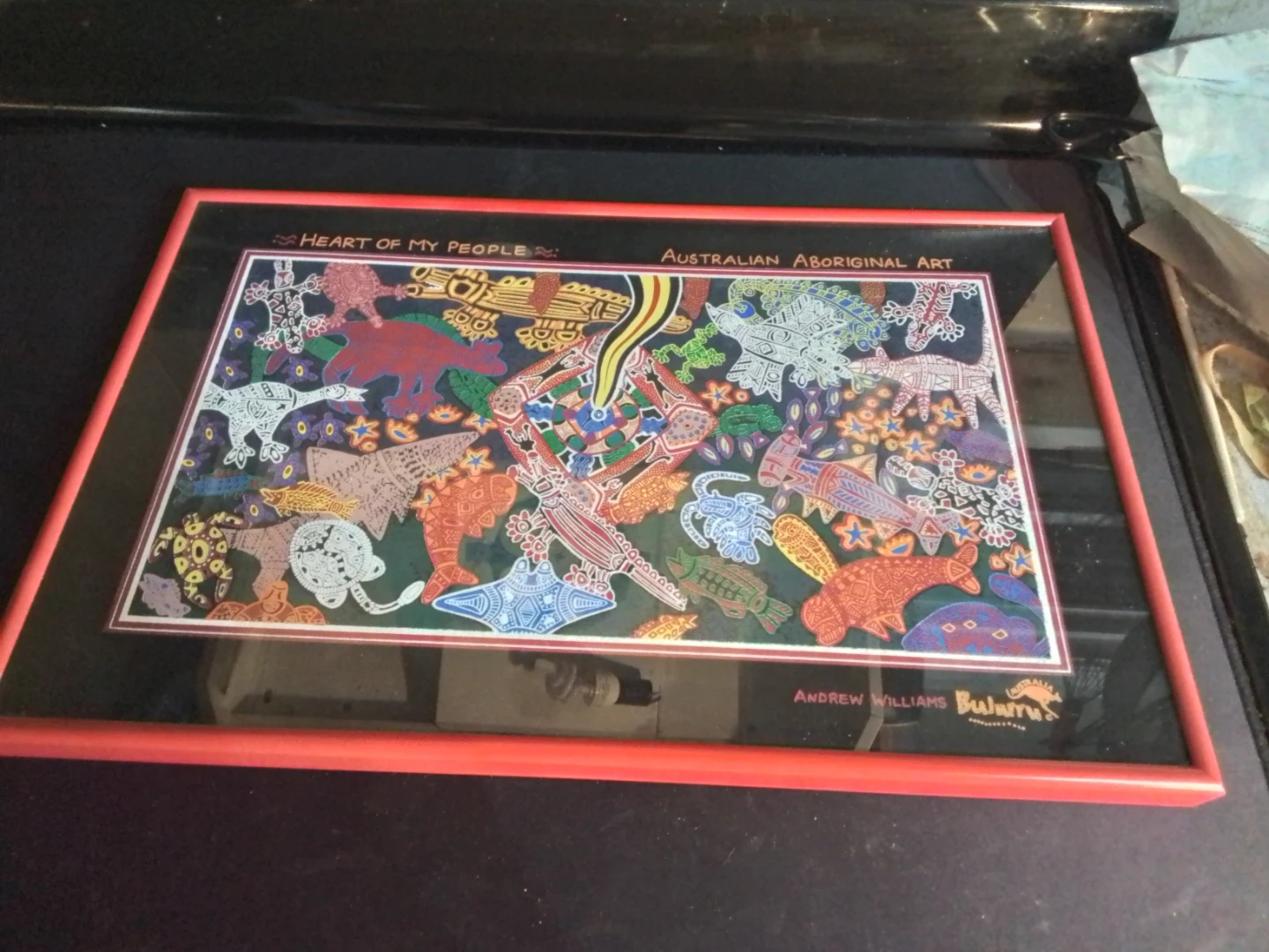 Framed Australian Aboriginal Art by Andrew Williams Burarra. This piece is titled "Heart of My People" and features vibrant colours and intricate designs. It's a beautiful addition to any art collection!
