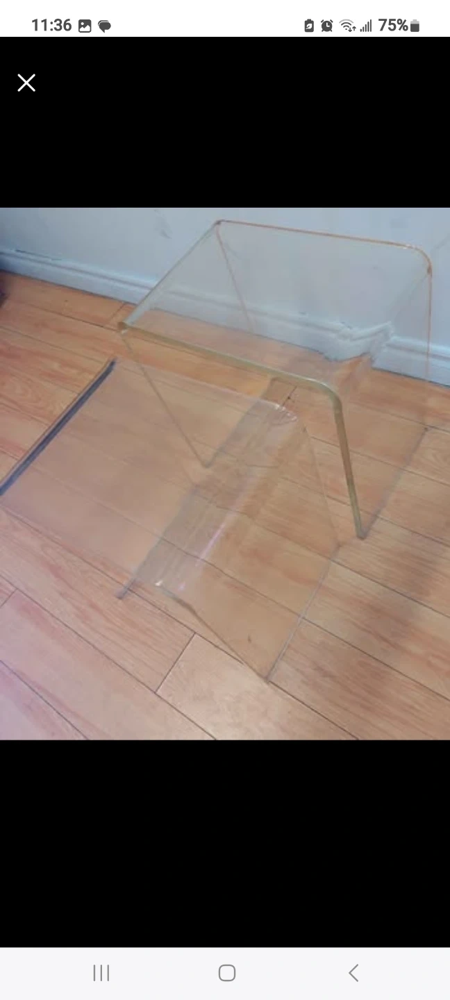 This is a clear vintage lucite side table. It's made of acrylic material. It's a great little table for a plant or a drink!