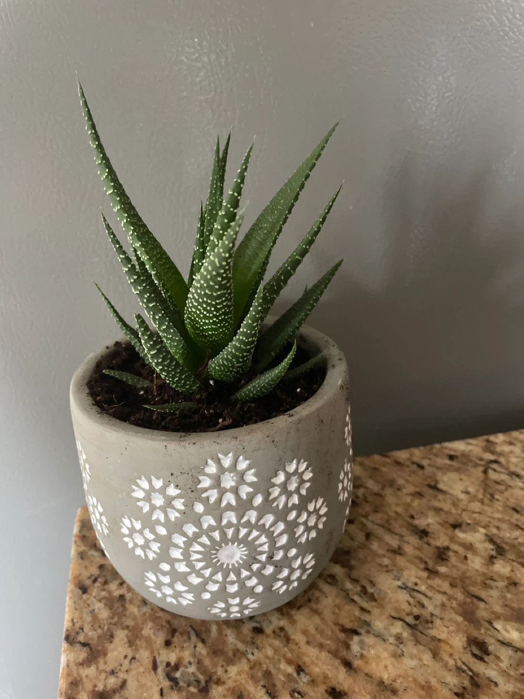 Healthy green succulent plant in a grey concrete pot with white decorative pattern. The pot measures approximately 5 inches tall. It's a lovely addition to any desk or shelf.