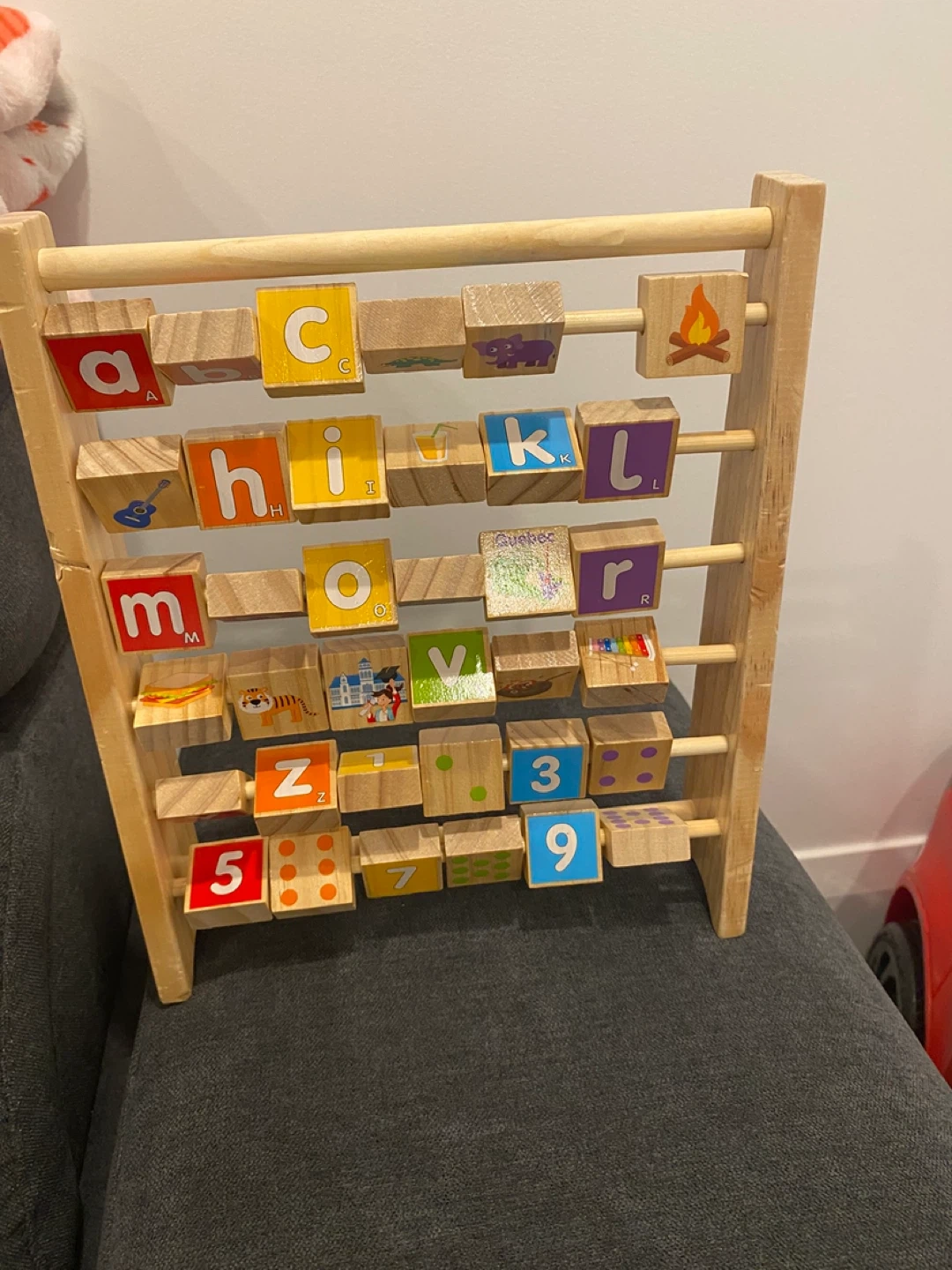 This wooden abacus features colourful blocks with letters and numbers. It's great for early learning and developing fine motor skills. Beads slide smoothly for interactive play.